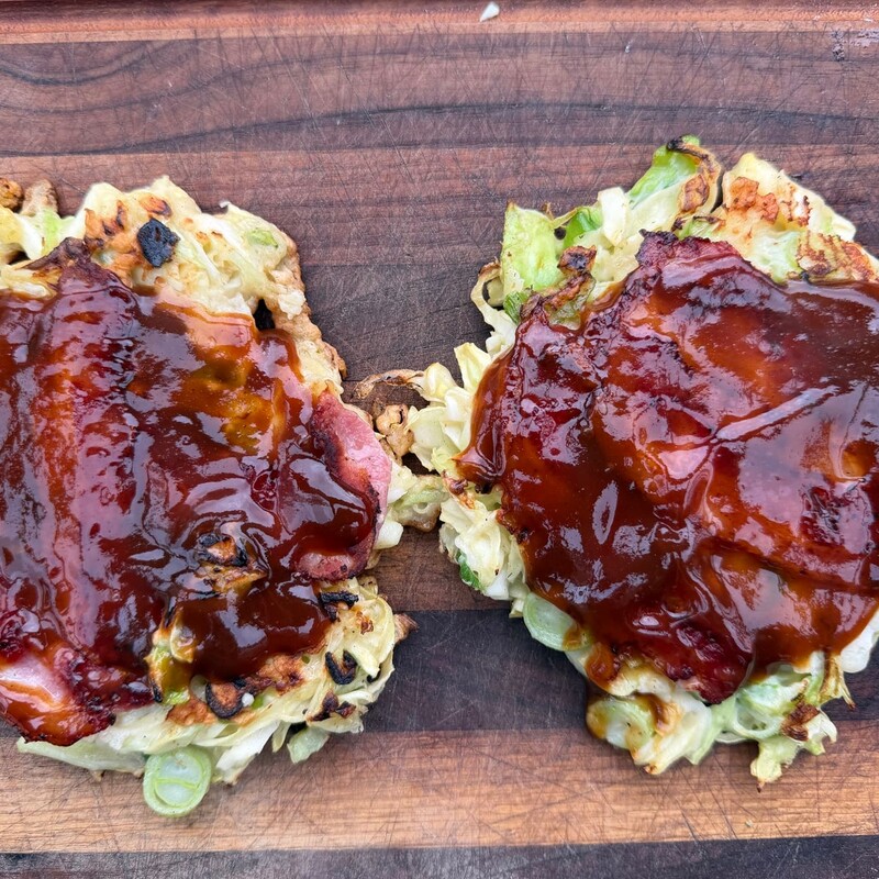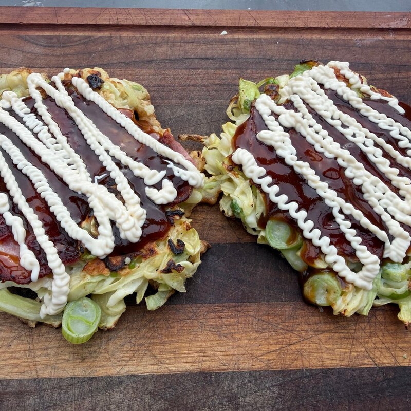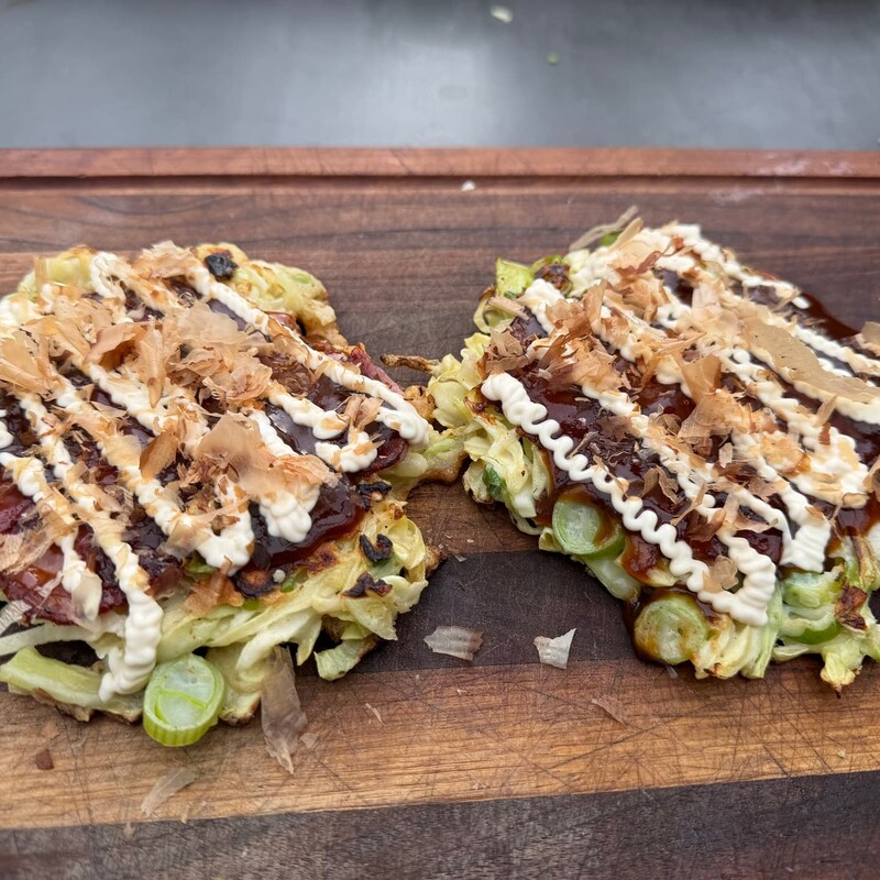 Okonomiyaki ist ein in Japan beliebtes Streetfood und wird häufig direkt auf einer heißen Grillplatte (Teppan) zubereitet. Er besteht aus einem Teig aus Dashi-Wasser, Mehl und Ei sowie fein geschnittenem Spitzkohl und Frühlingszwiebeln. Zum Schluss wird der japanische Pfannkuchen im Osakastyle noch mit Okonomiyaki-Sauce, Sushi-Mayo und Bonitoflocken getoppt.