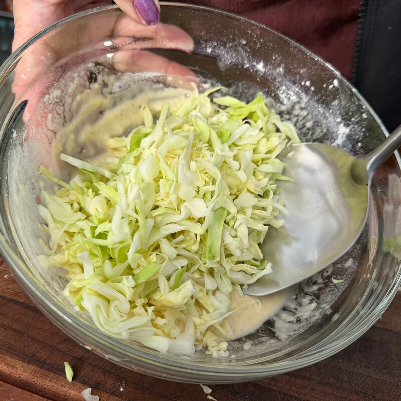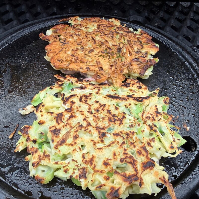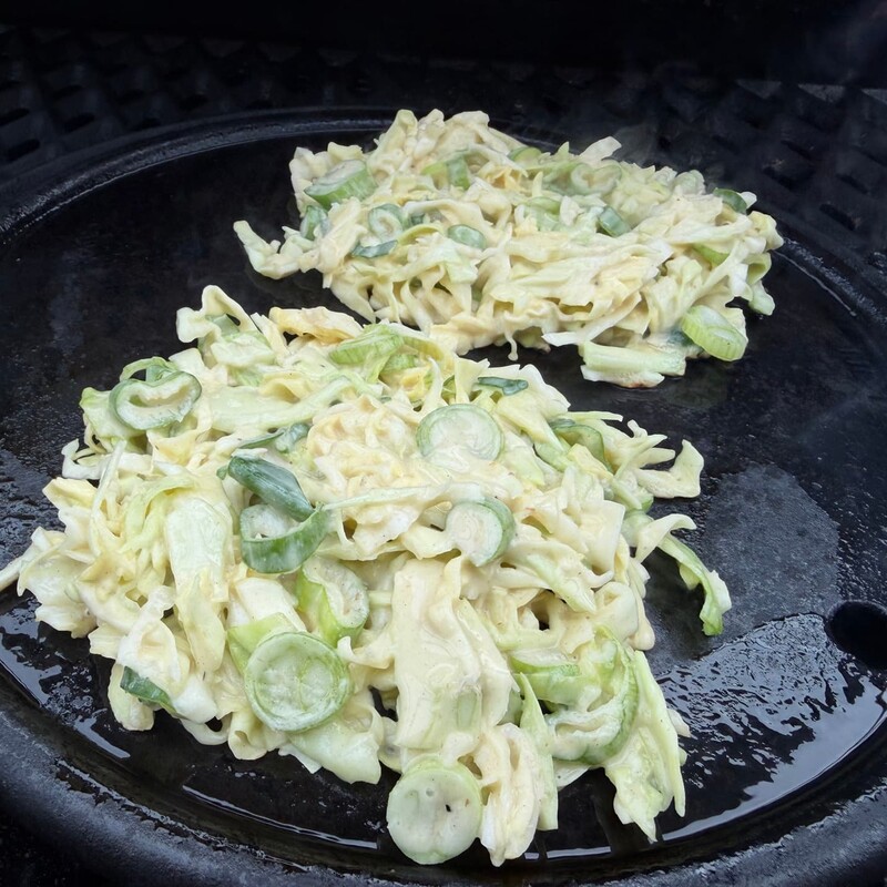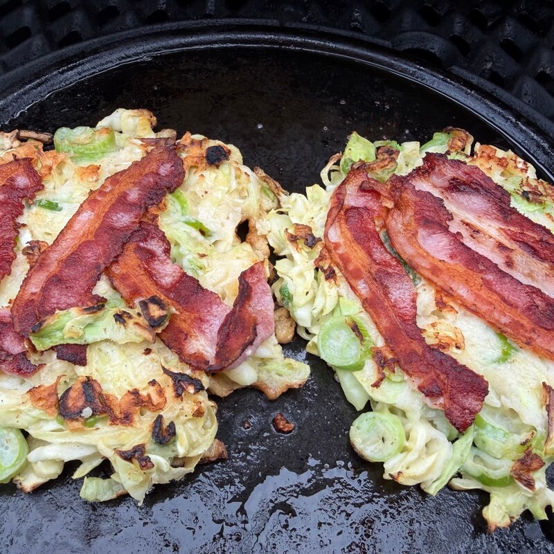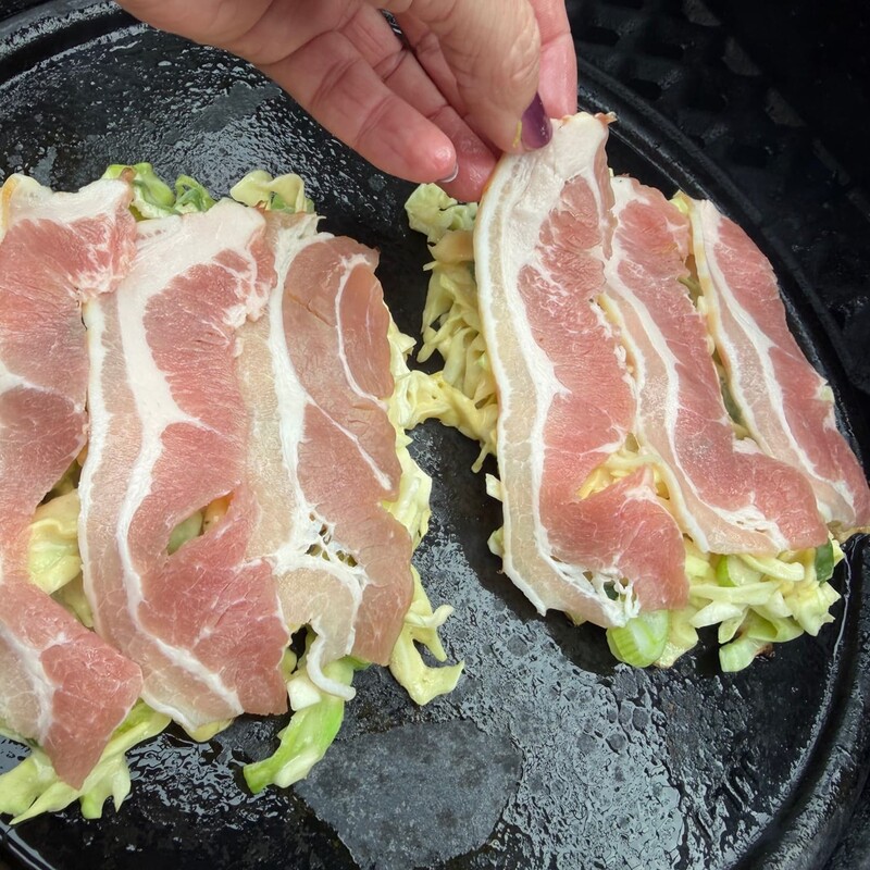 Nun das geschnittene Gemüse unter den Teig heben und die Grillplatte leicht einölen. Mit einer Kelle portionsweise Teig auf die heiße Platte geben und die Fladen direkt mit Bacon belegen. Nach etwa 3 Minuten wendest Du die Okonomiyaki vorsichtig und grillst die Bacon-Seite weitere 3 Minuten.