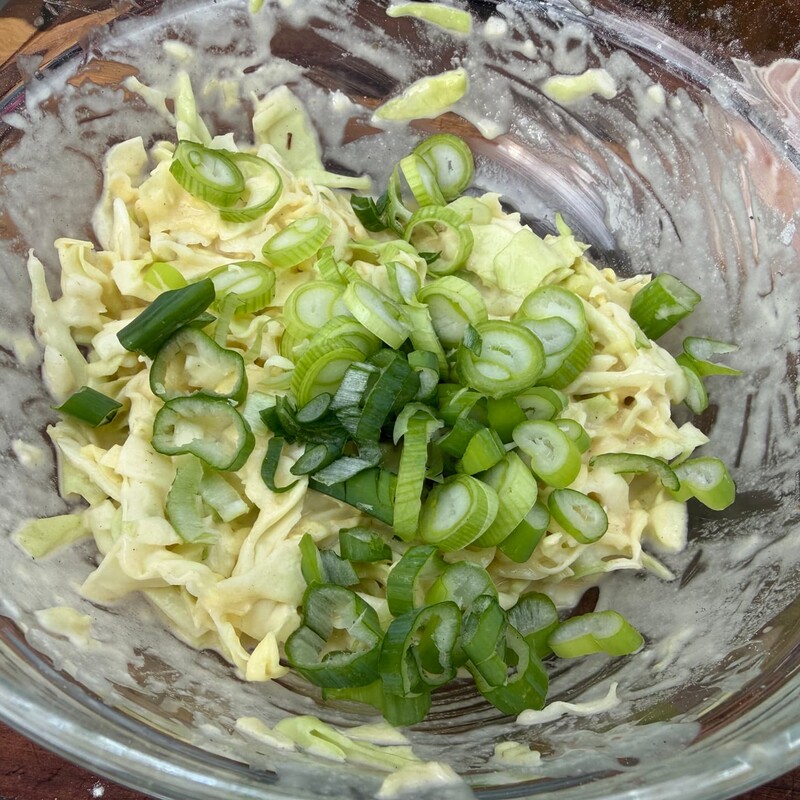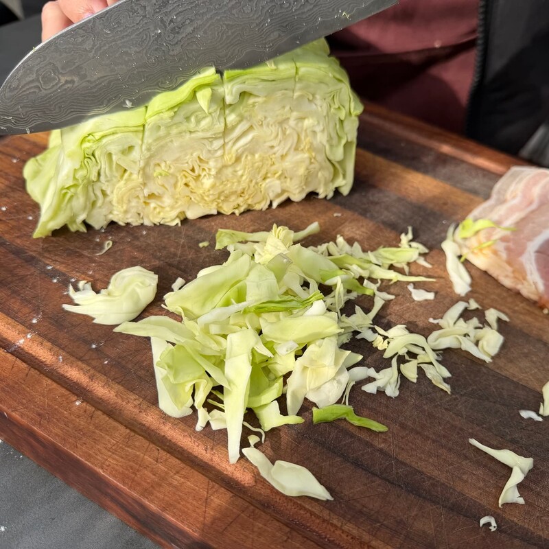 In der Zwischenzeit schneidest Du den Spitzkohl mit einem Messer in feine Streifen und die Frühlingszwiebeln in feine Ringe. Zum Schluss halbierst Du noch den Bacon.