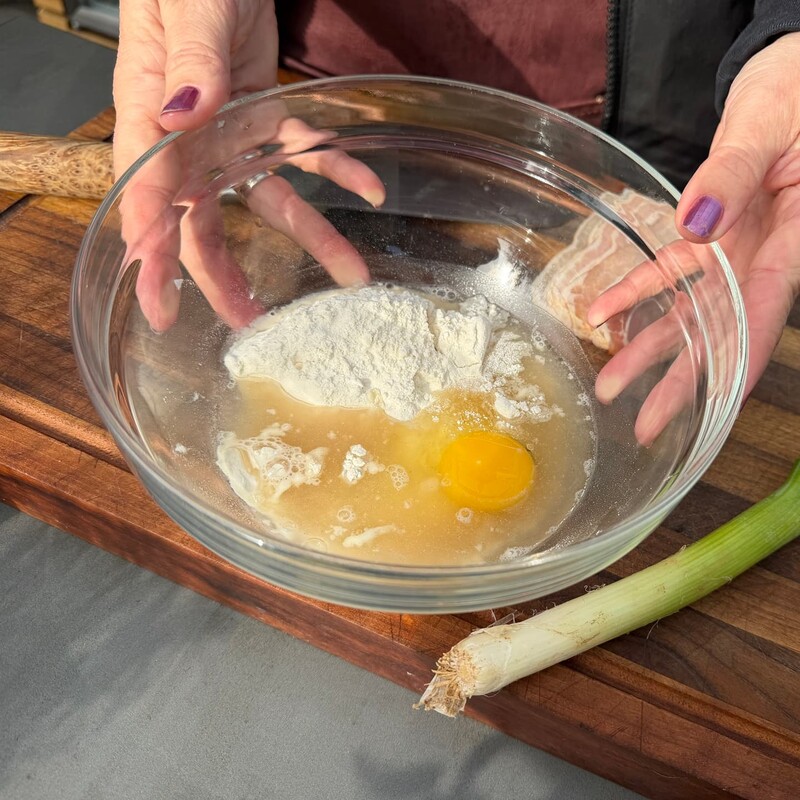 Zunächst löst Du das Dashi-Pulver in Wasser auf. Anschließend die Mischung mit Mehl und Eiern zu einem glatten Teig verrühren und diesen kurz kaltstellen.