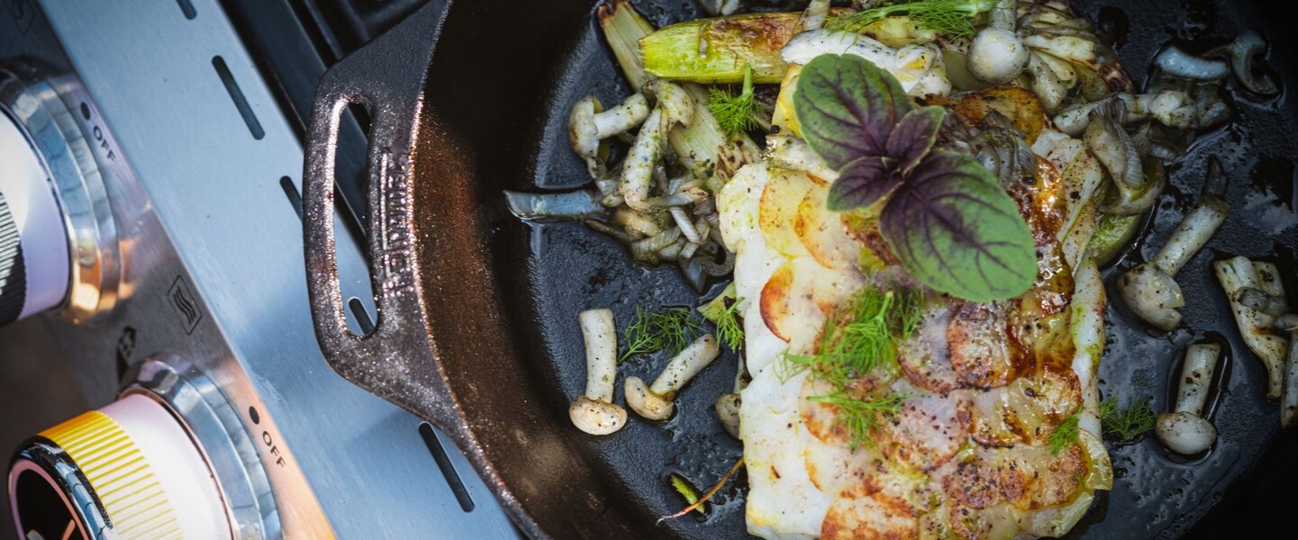Den Fenchel vom Grill nehmen und die Pilze dazu geben. Das Kabeljaufilet darauf anrichten.