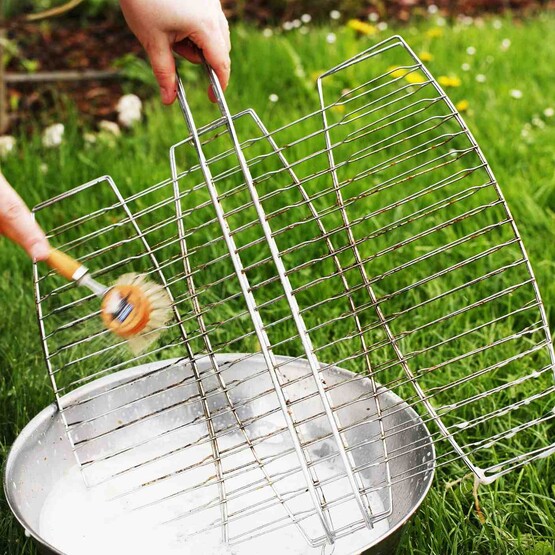 Damit Du an der Reinigung Deines Grillrostes nicht verzweifelst, hilft es, das Gitter samt angebrannten Fett- und Fleischresten direkt im am Anschluss (!) an das Grillen heiß abzubrennen, die Anhaftungen abzukratzen und hartnäckige Verschmutzungen einzuweichen.