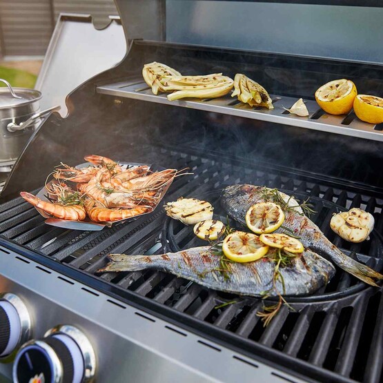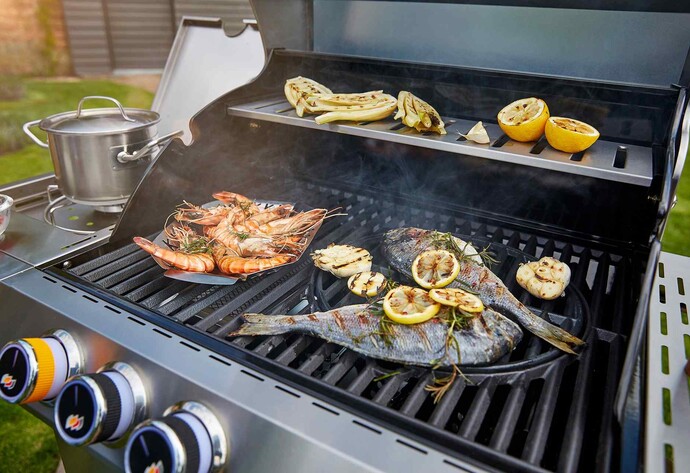 Den Schmutz am Rost entfernst Du, indem Du nach dem Essen den Gasgrill auf „volle Pulle“ schaltest und 15 Minuten bei geschlossenem Deckel die Grillrückstände am leeren Rost wegbrennen lässt.