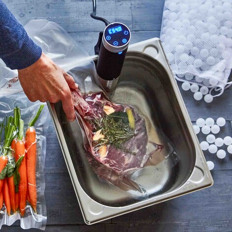 Hast Du die Zieltemperatur im Wasserbad erreicht ist, kann Du das Fleisch mit dem Sous-Vide-Stick garen. Falls vorhanden, bedecke das Fleisch mit Isolationskugeln für einen besseren Wärmeerhalt! Achte darauf, dass der Beutel komplett mit Wasser bedeckt ist.
