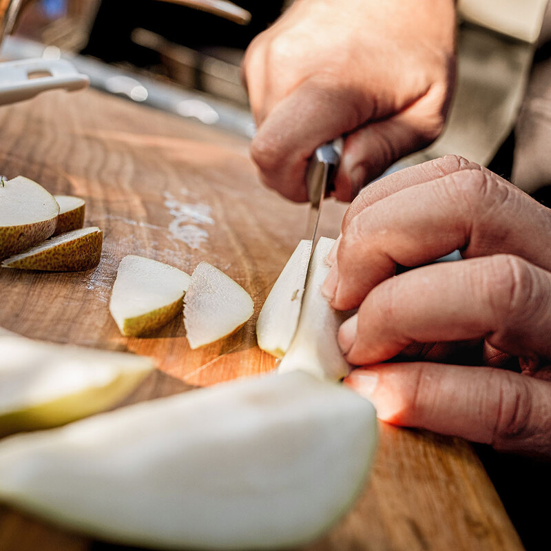 Den Rosenkohl zubereiten und die einzelnen Blättchen lösen. Die Birne in Spalten scheiden und das Kerngehäuse entfernen.