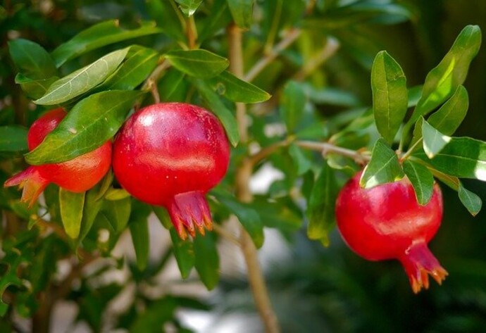 Sommer: Granatäpfel lieben es sonnig. Der buschige Strauch wird bis zu 4 Meter hoch. Bei Boden und Wasser stellt er keine großen Ansprüche, nur Nährstoffe müssen da sein.