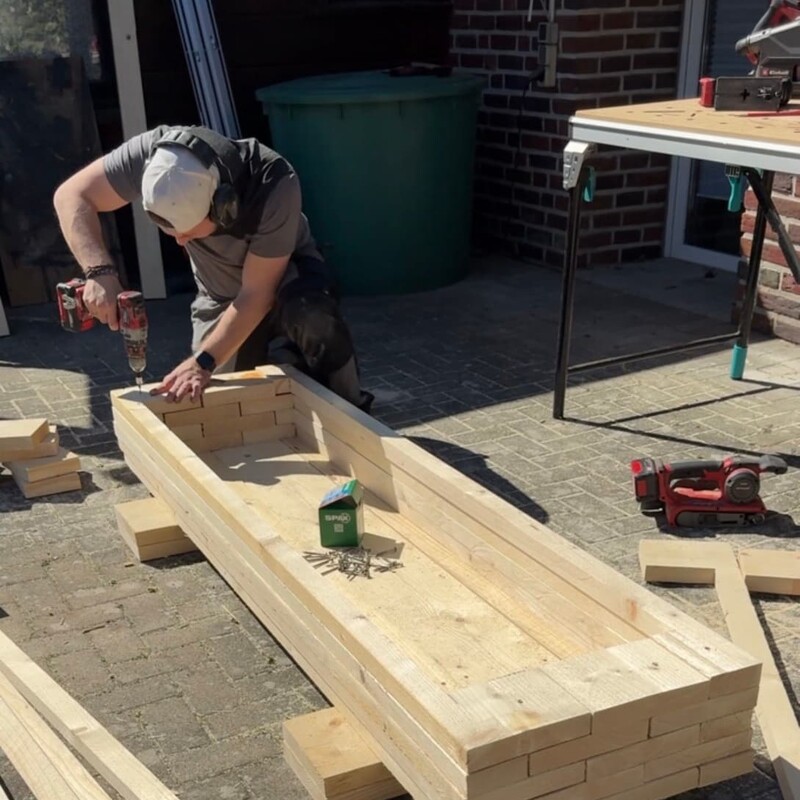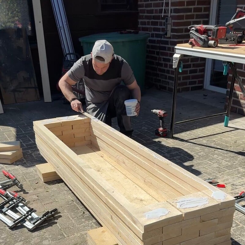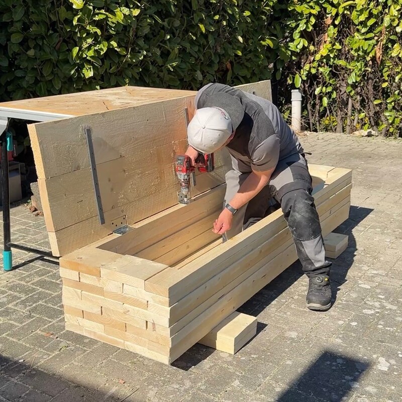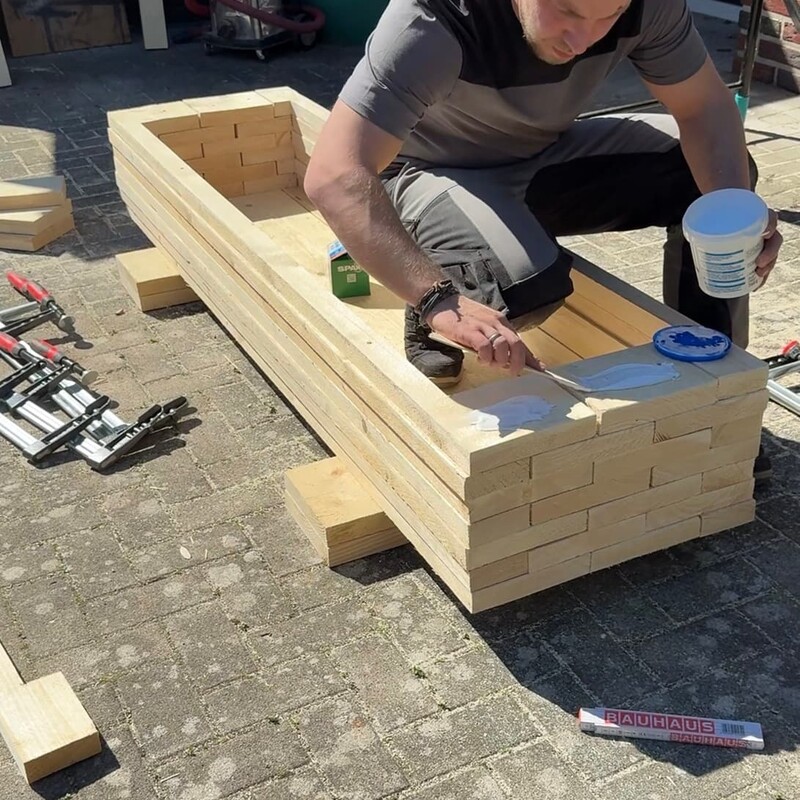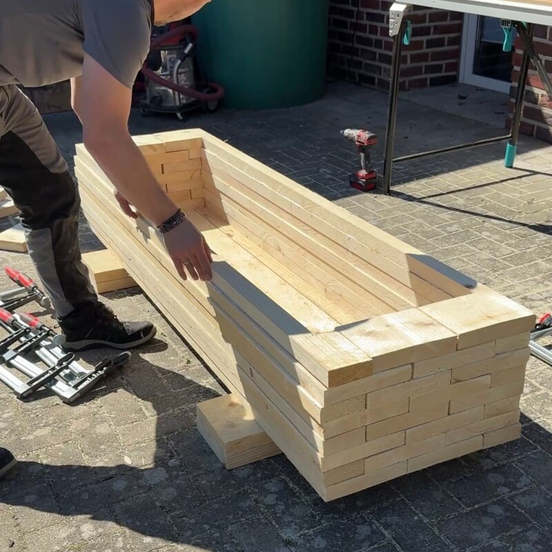 Jetzt legst Du alle vorbereiteten Dielen Lage für Lage übereinander und verschraubst sie jeweils mit den darunterliegenden Dielen. Achte dabei unbedingt auf einen gleichmäßigen Versatz für mehr Stabilität.