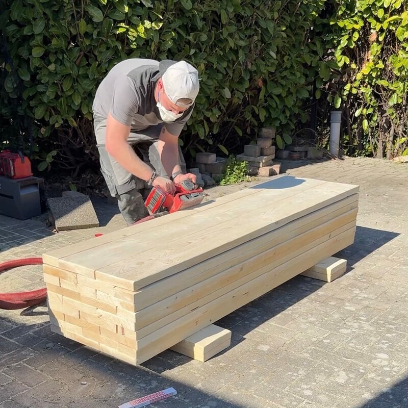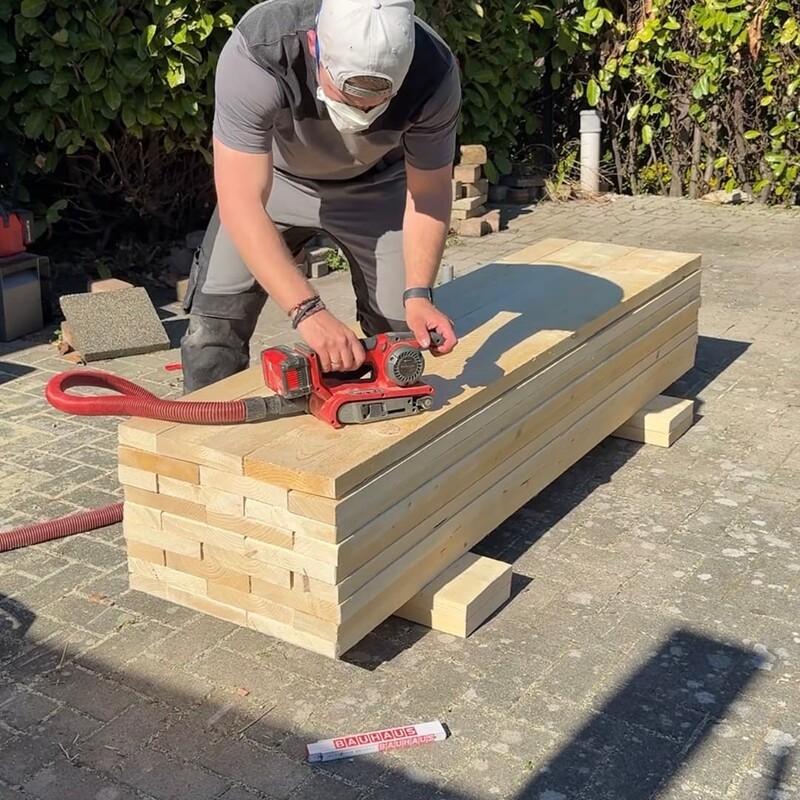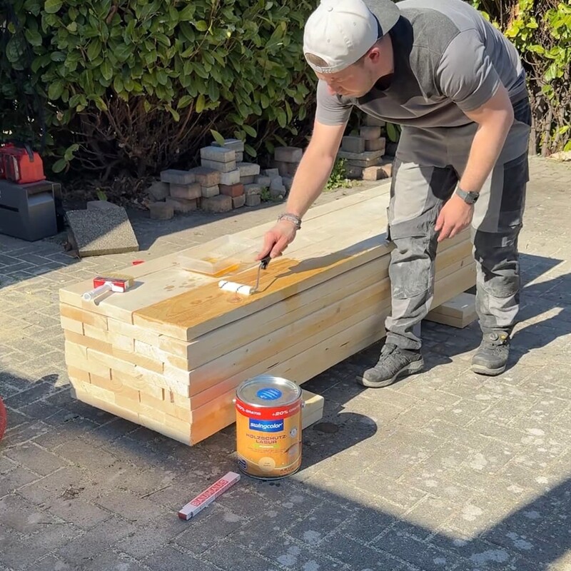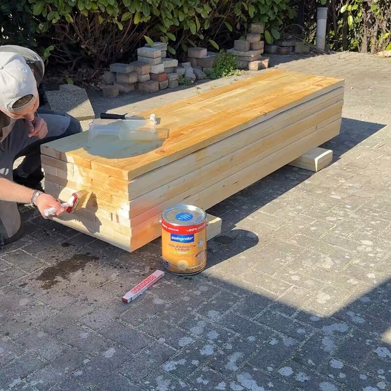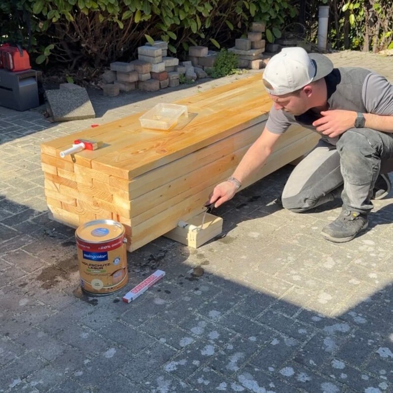 Zum Schluss schleifst Du alle Oberflächen gründlich mit einem Bandschleifer ab und trägst anschließend zwei Schichten Holzlasur auf, um das Holz zu schützen und optisch aufzuwerten.