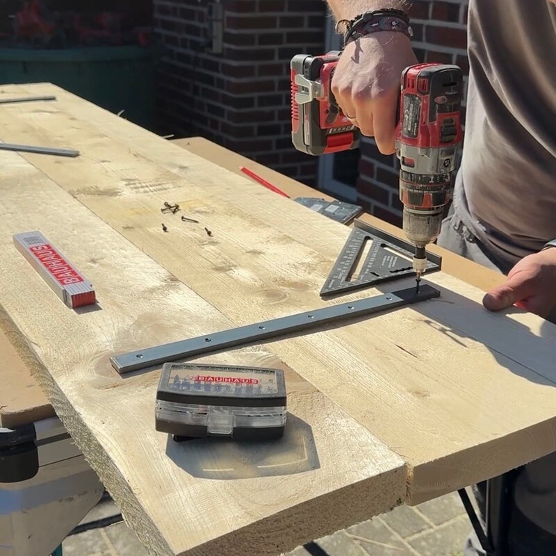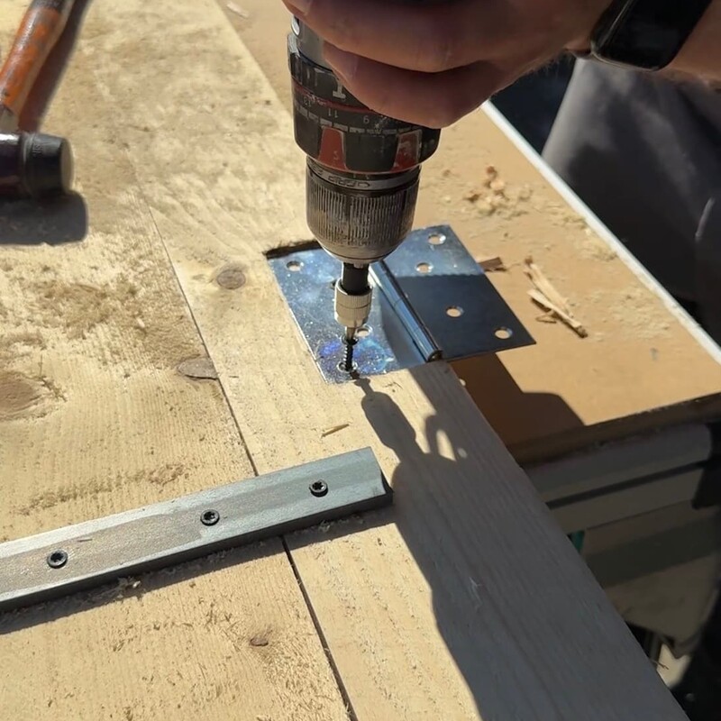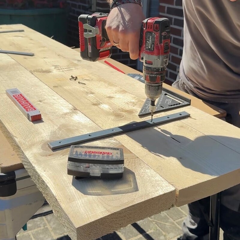 Jetzt verbindest Du zwei 20 cm breite und eine 10 cm breite, jeweils 2 m lange Holzdielen mithilfe von drei vorgebohrten Flachprofilen miteinander.