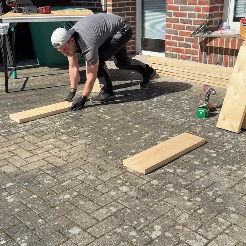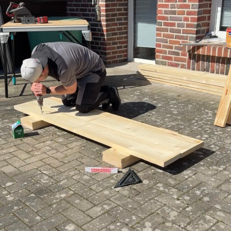 Auf diese Elemente werden nun drei 2 m lange Holzdielen quer verschraubt – zwei Dielen mit einer Breite von 20 cm und eine mit 10 cm.