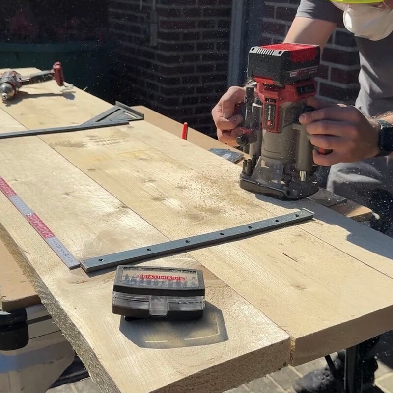 Fräse mit einer Oberfräse drei Aussparungen für die Scharniere an der hinteren Kante des Deckels.