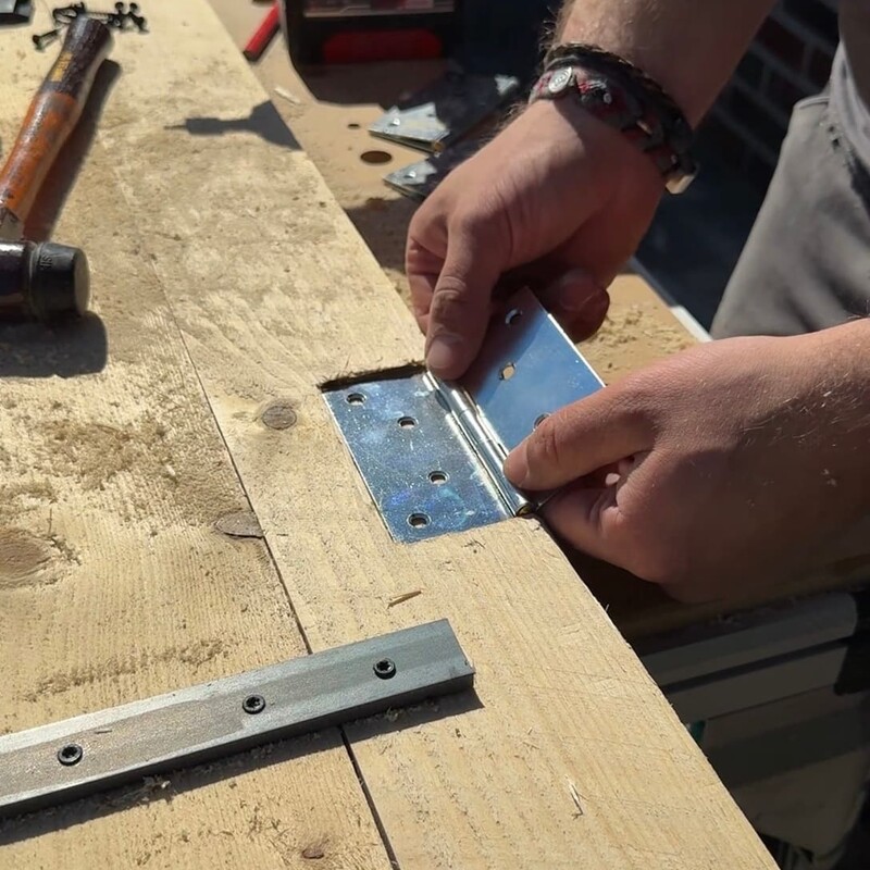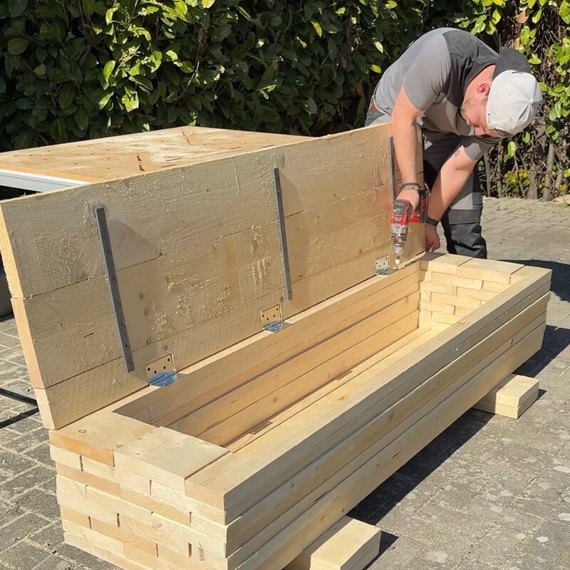 Jetzt setzt Du die Scharniere ein und befestigst den Deckel am unteren Teil der Bank.