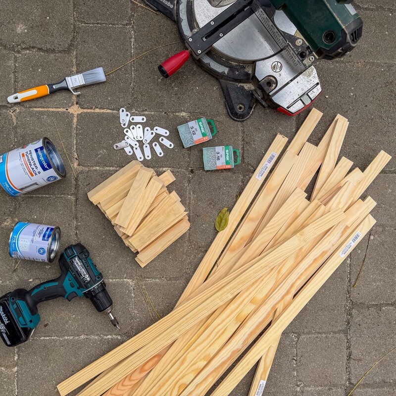 (in unserem Beispiel mit den Maßen 10 - 20 mm Stärke, 30 - 50 mm Breite, Länge je nach Heizkörperhöhe) - Leisten oder Vierkanthölzer für den Rahmen