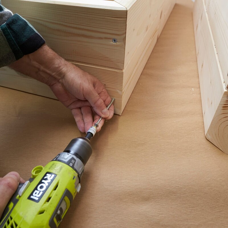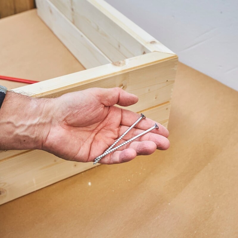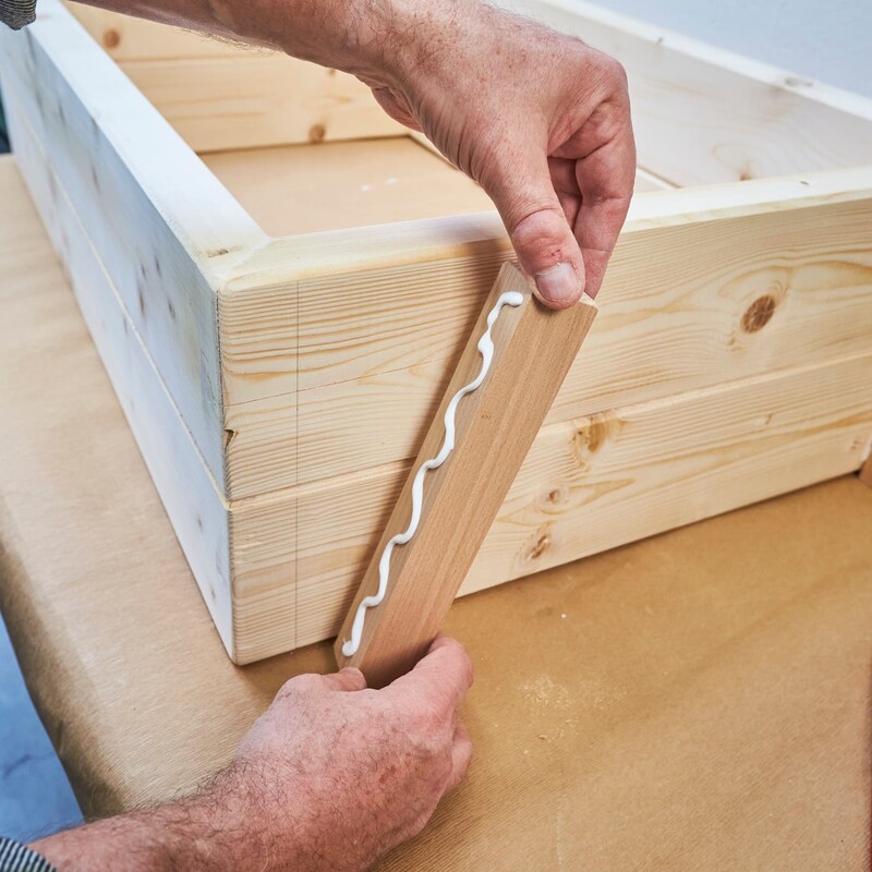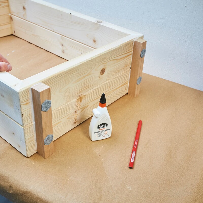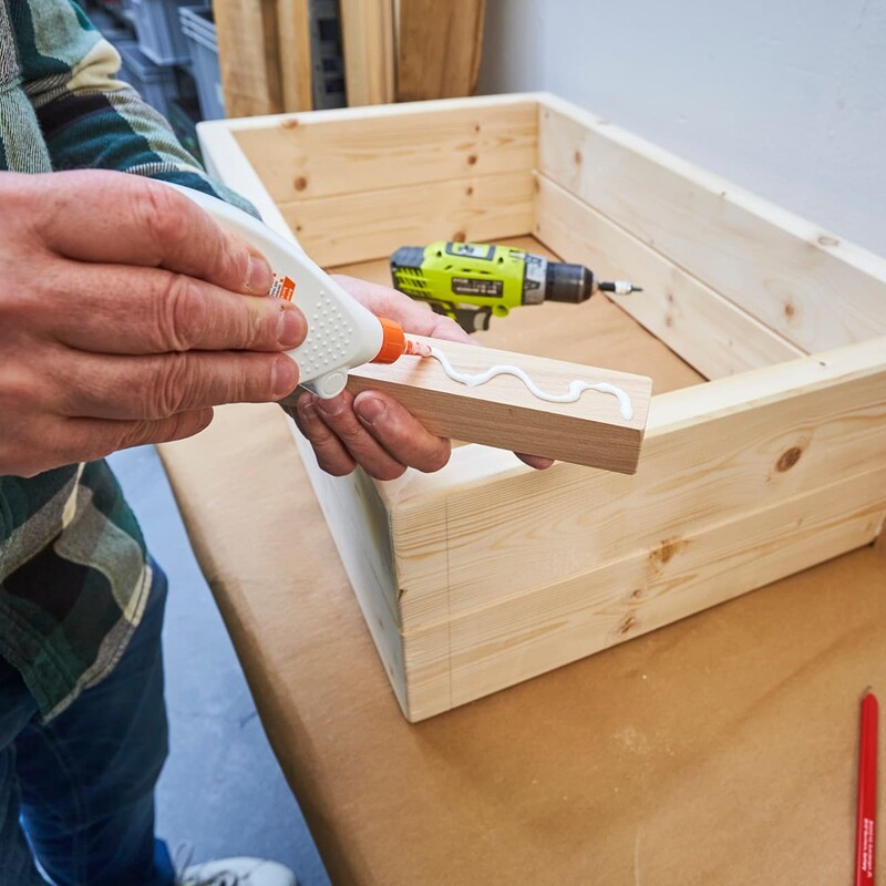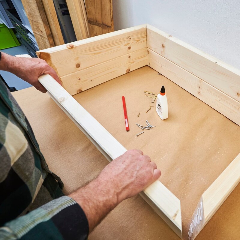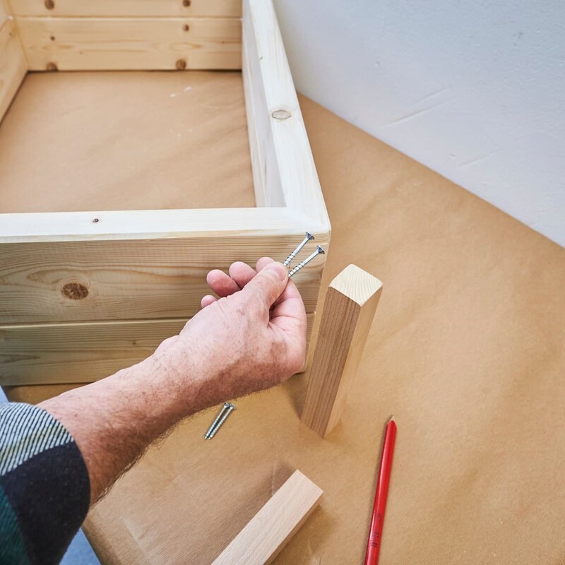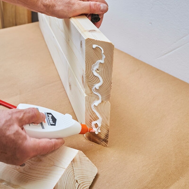 In diesem Schritt verleimst Du die vier Teile miteinander. Zeichne Dir die Schraubenlöcher an und bohre sie mit einem Holzbohrer vor. Dann schraubst Du die vier Teile mit Holzschrauben zusammen.