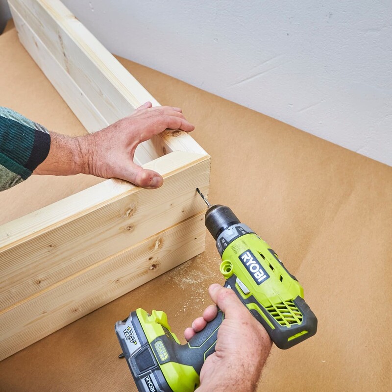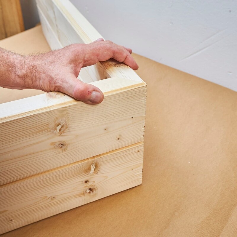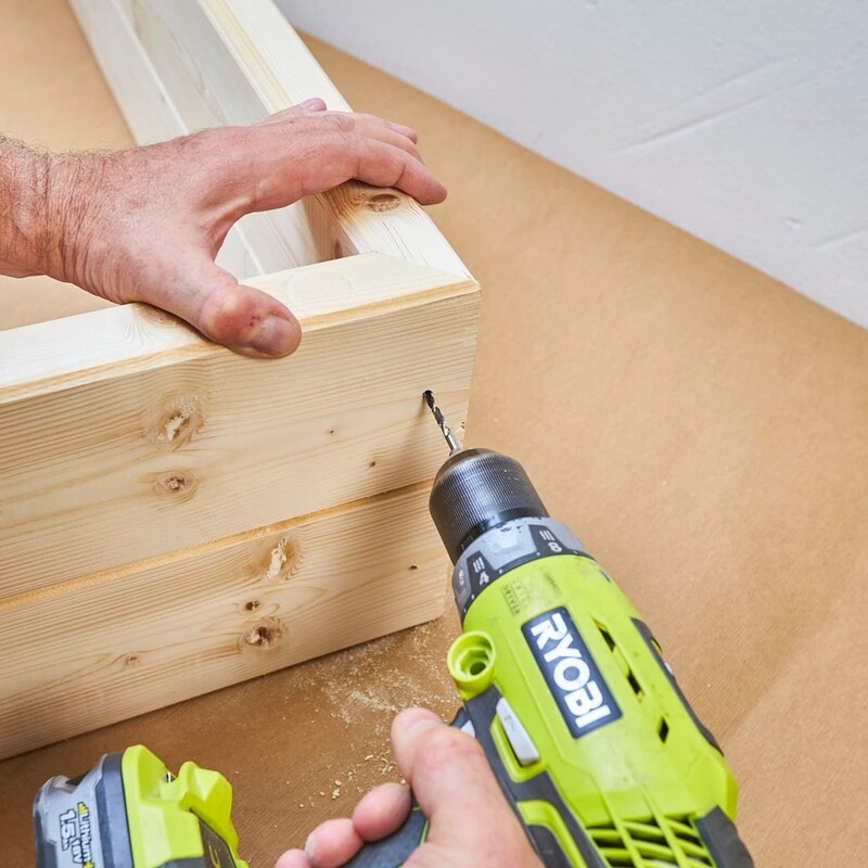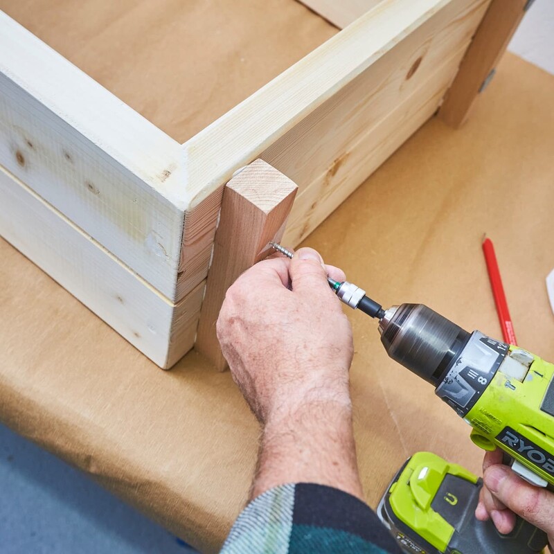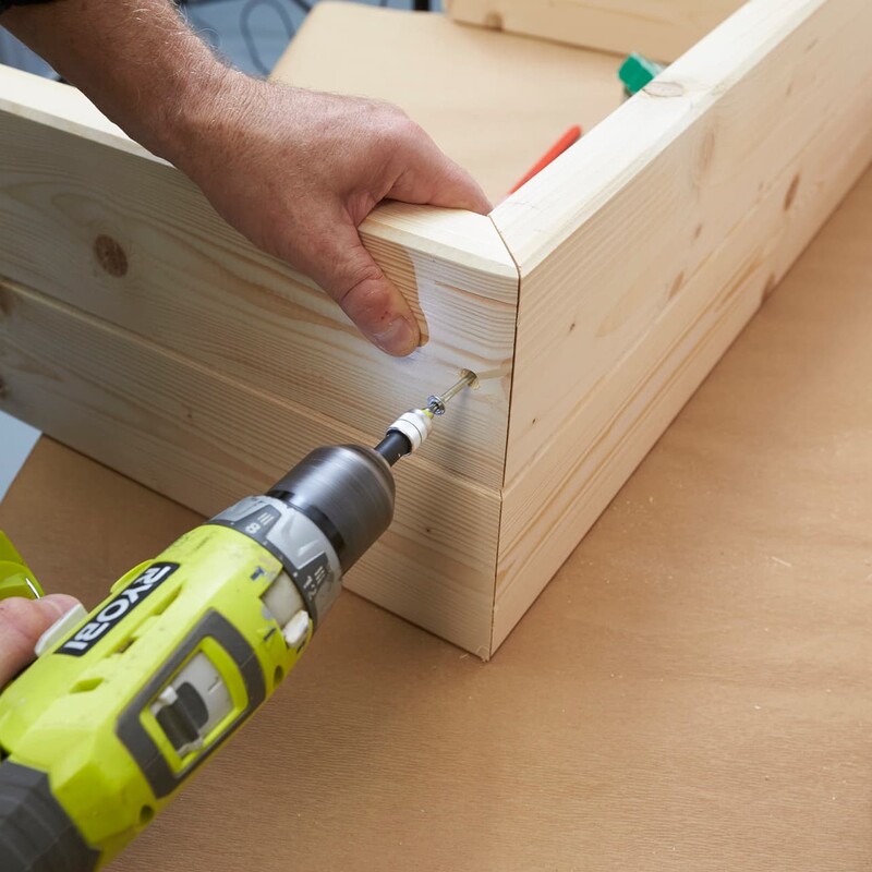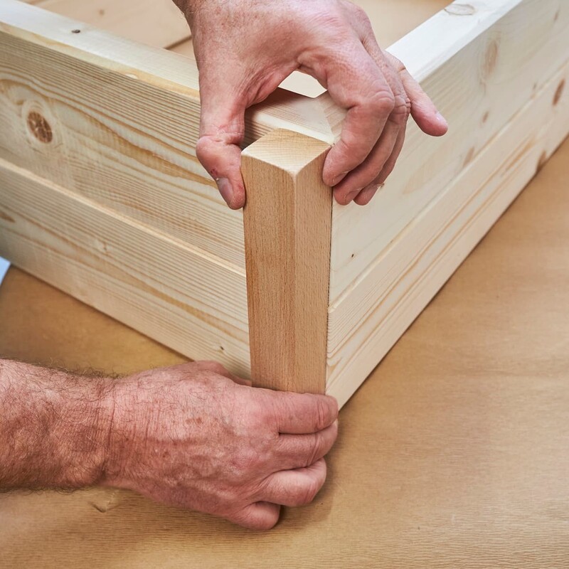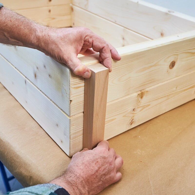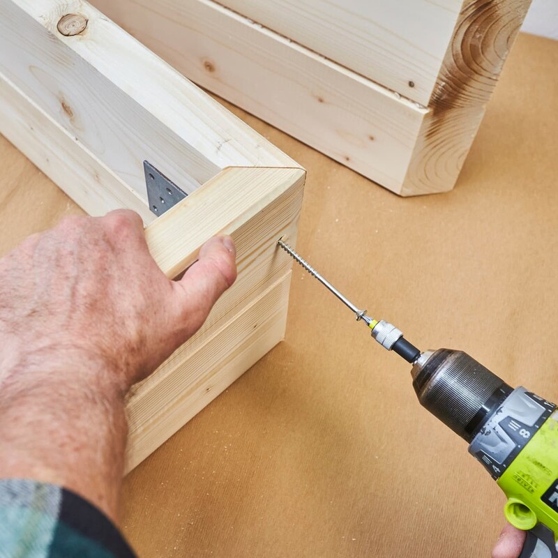 In diesem Schritt verleimst Du die vier Teile miteinander. Zeichne Dir die Schraubenlöcher an und bohre sie mit einem Holzbohrer vor. Dann schraubst Du die vier Teile mit Holzschrauben zusammen.
