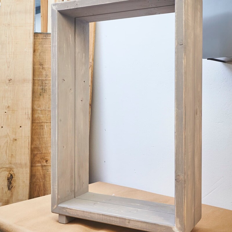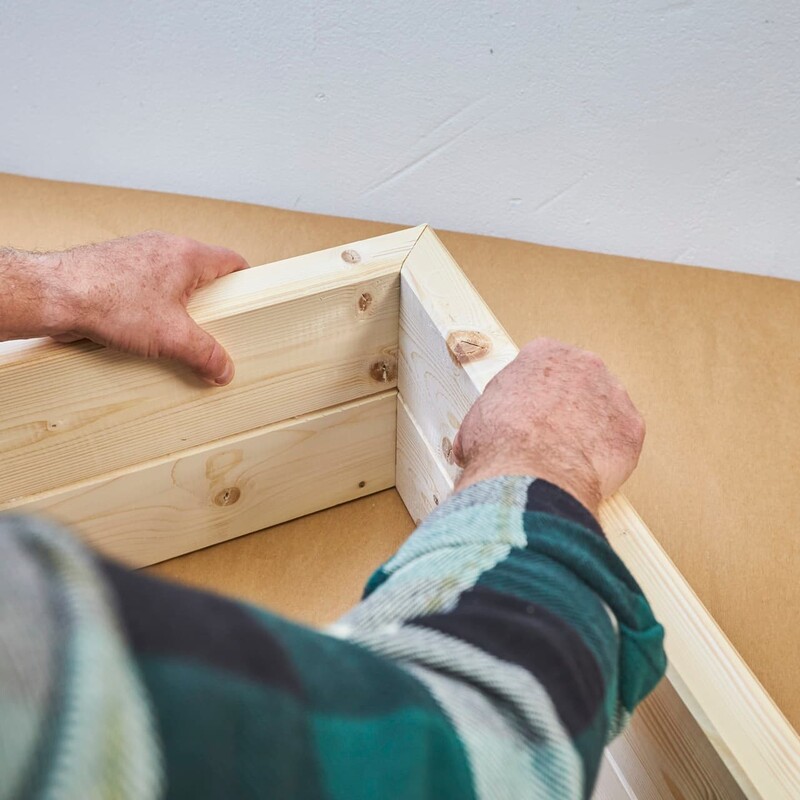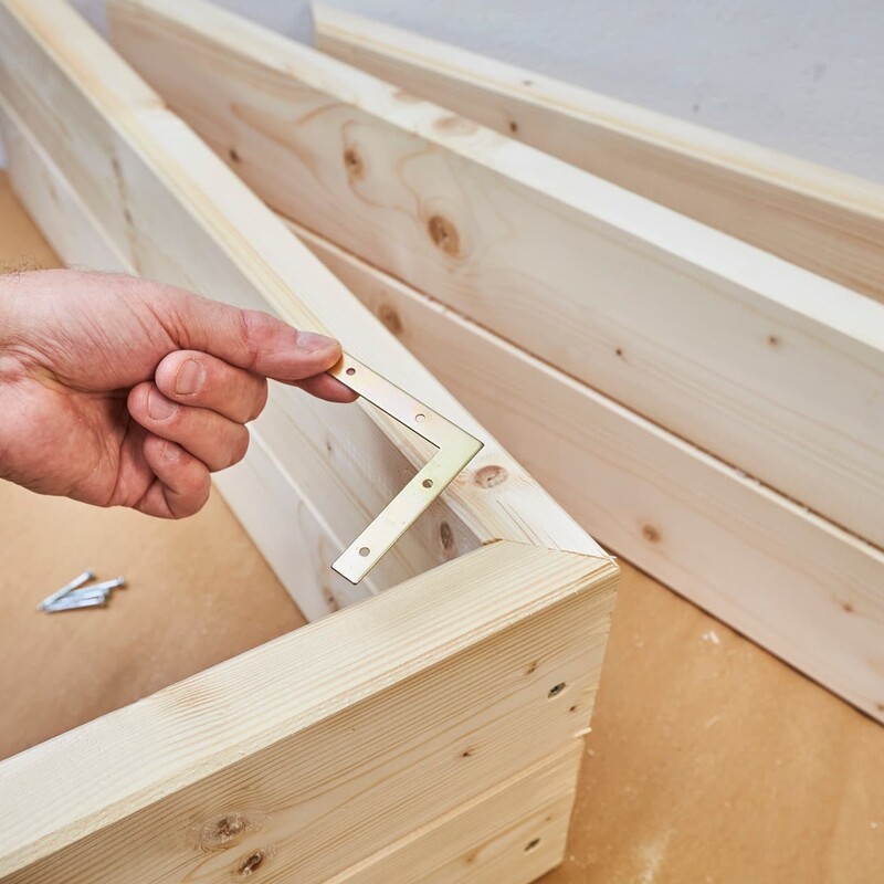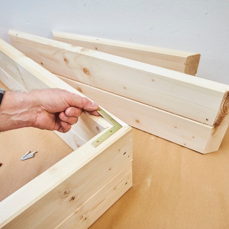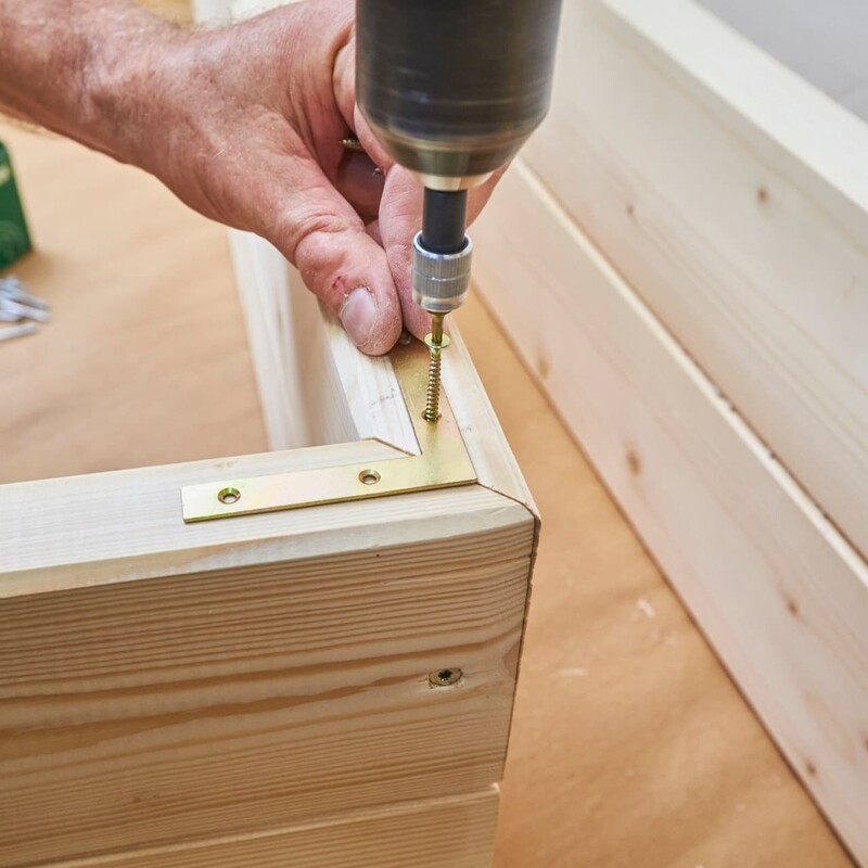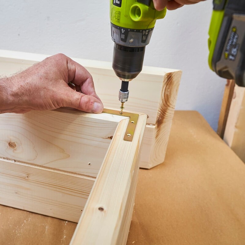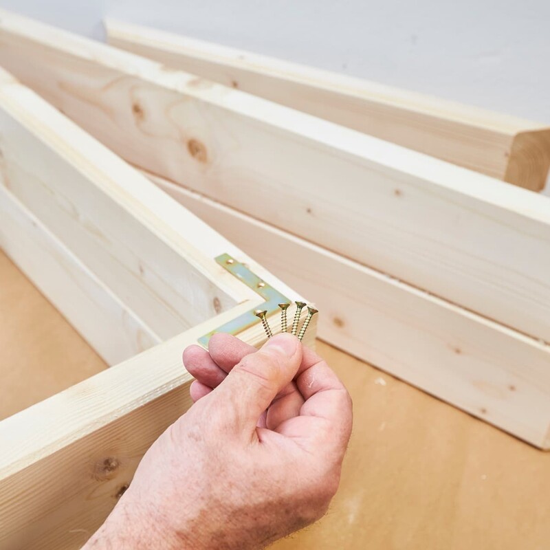 Für den sicheren Halt des Rahmens befestigst Du auf der Rückseite an den Ecken jeweils vier Winkel mit Schrauben.