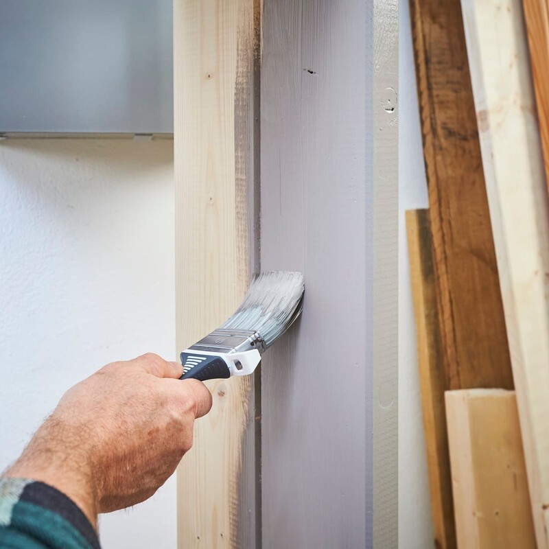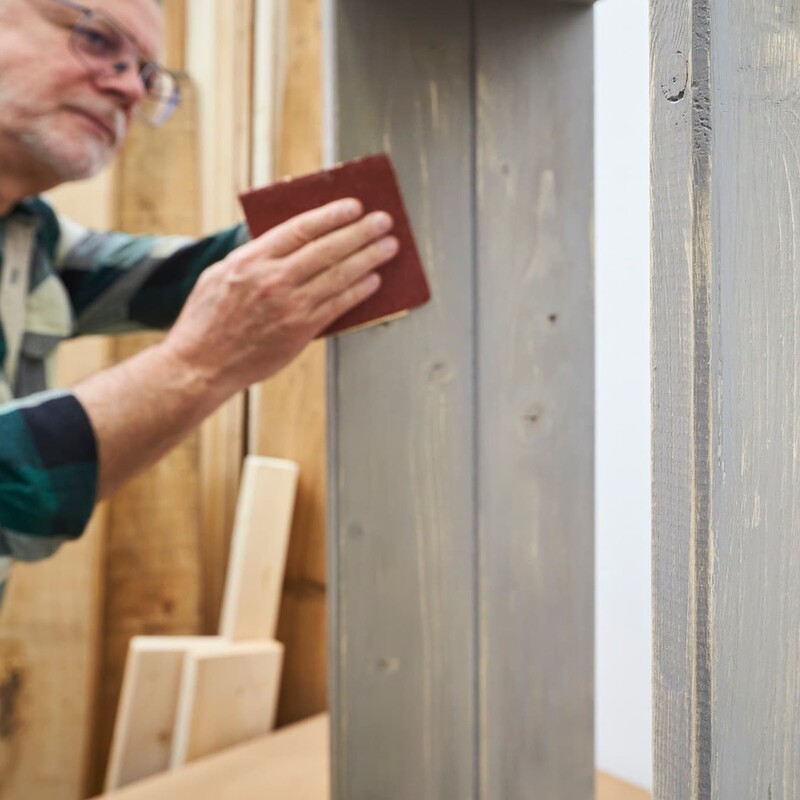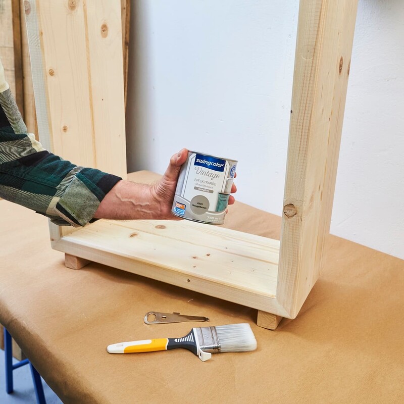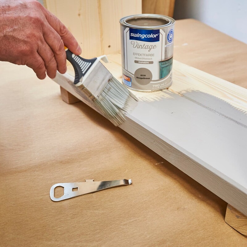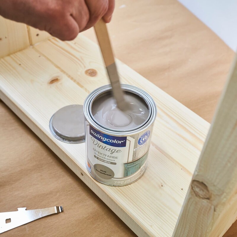 Trage die swingcolor Vintage Effektfarbe Nougatbraun gleichmäßig auf, um das Holz vor Feuchtigkeit und Schmutz zu schützen.
