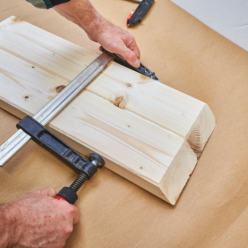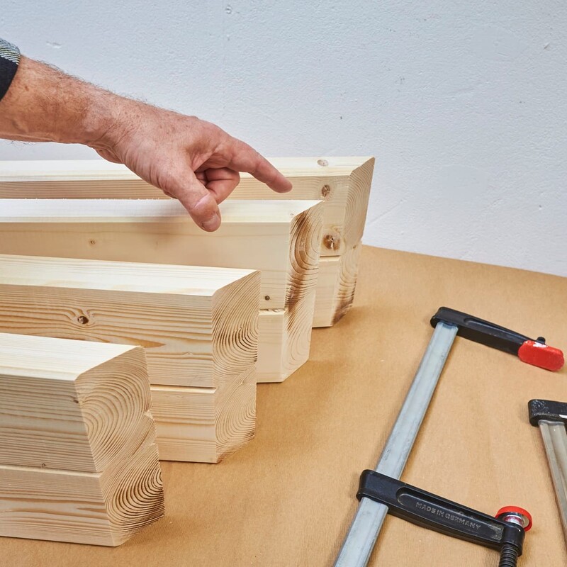 Jetzt sägst Du entlang der gezeichneten Linien, bevor Du jeweils zwei Bretter miteinander im nächsten Schritt verleimst.
