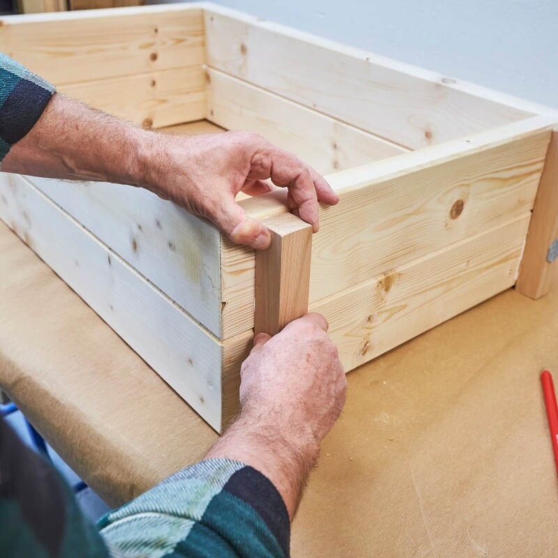 Jetzt bestimmst Du die gewünschte Position der Füße am Regal und zeichnest sie an. Du leimst und verschraubst die Füße an Deine markierten Stellen.