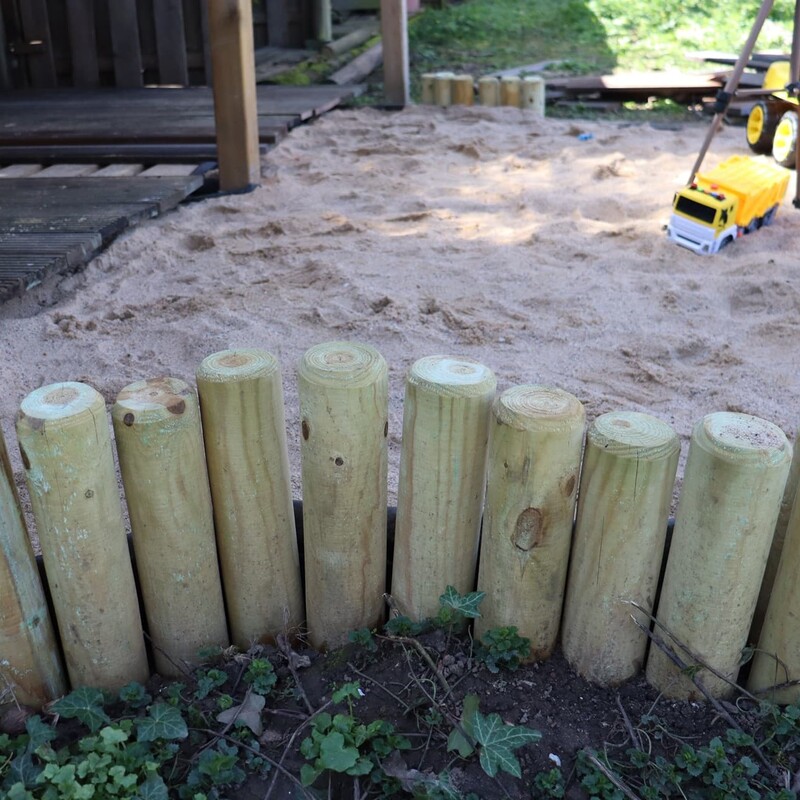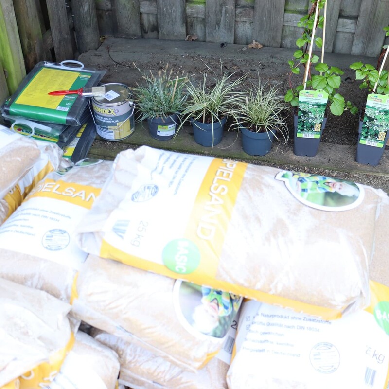 Zuerst besorgst Du Dir das passende Material in einem BAUHAUS Fachcentrum in Deiner Nähe. Wir haben uns für Einschlagpfähle entschieden, die die geplante Sandfläche umfassen sollen.