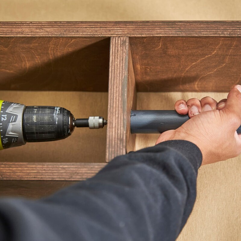 Befestige die Haltestange anschließend, indem Du eine Schraube durch das Seitenteil und die Stange drehst.