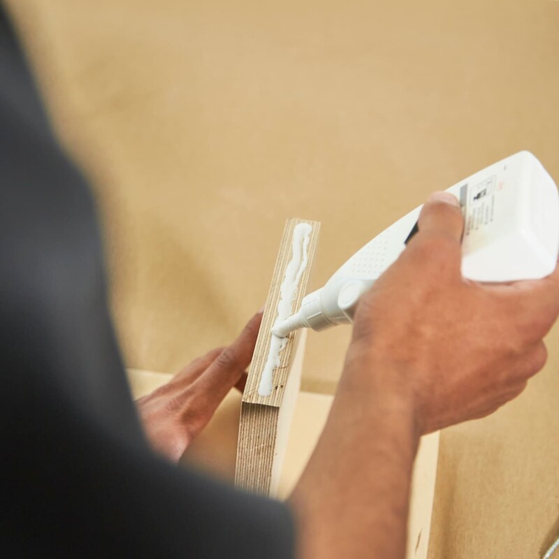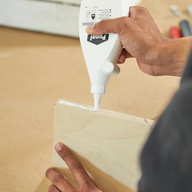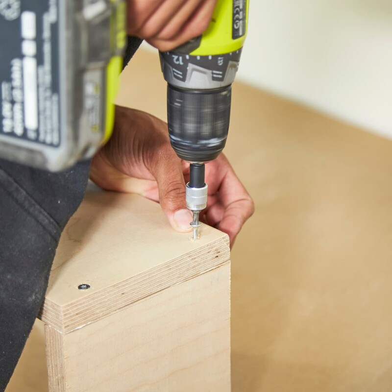 In diesem Schritt verleimst Du den Deckel, den Boden und die Seitenteile mit Holzleim. Zusätzlich schraubst Du alle Teile mit Holzschrauben für einen sicheren Halt zusammen.