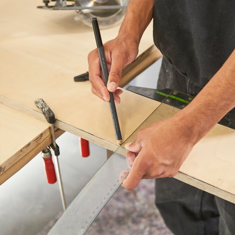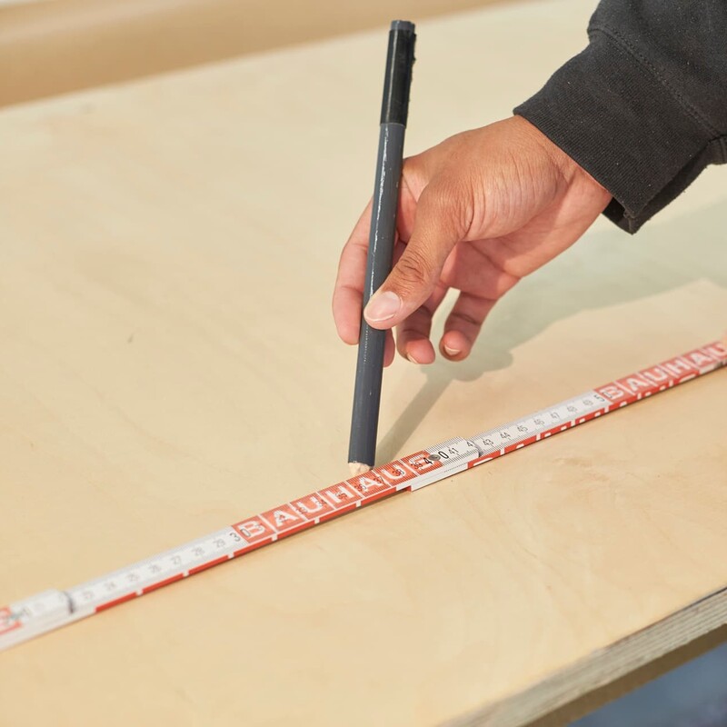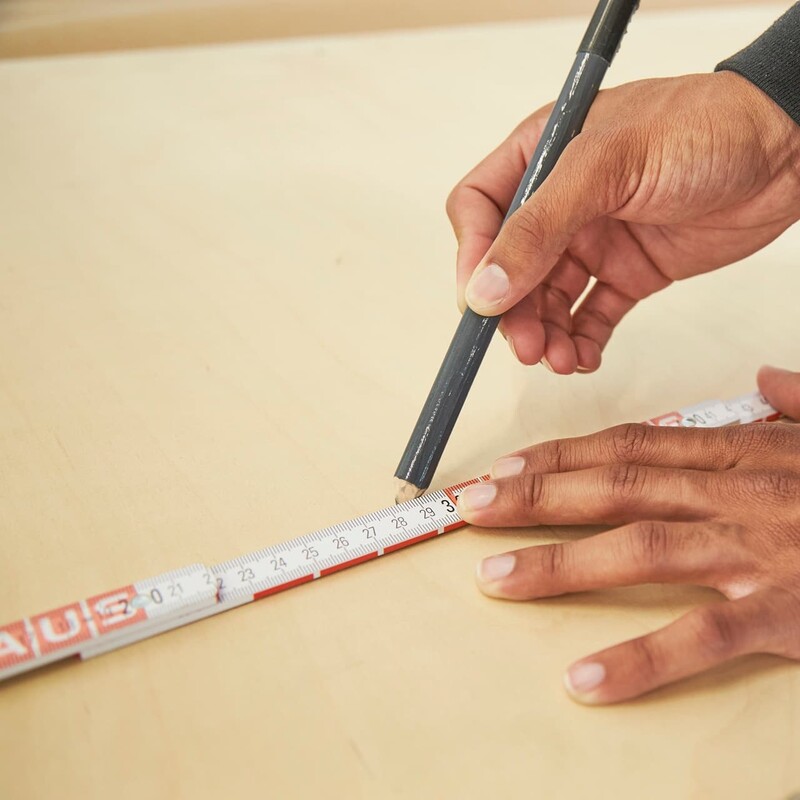 Jetzt überträgst Du die Maße mit einem Zollstock auf Deine Holzplatte und zeichnest sie mit einem Bleistift an.