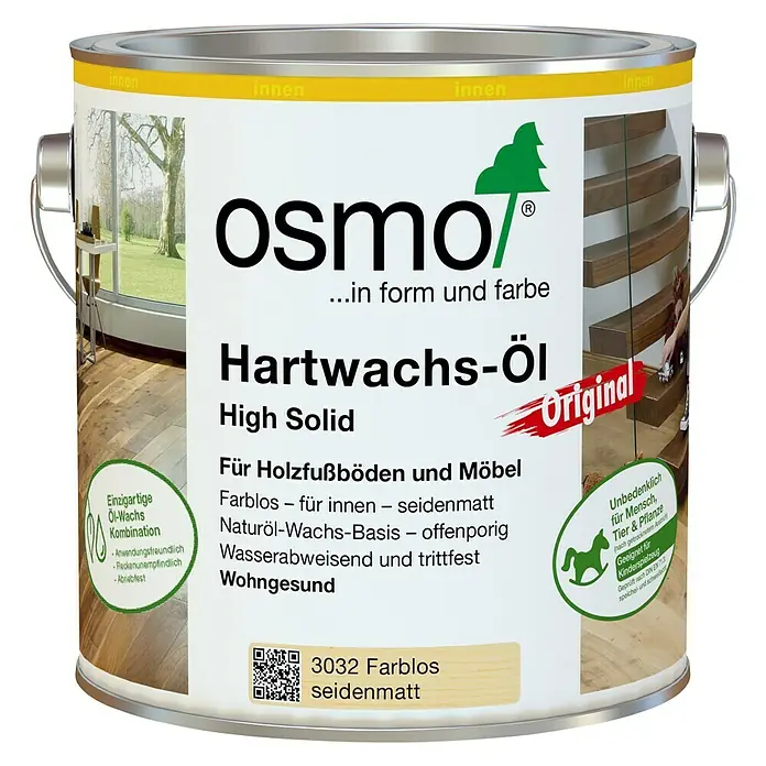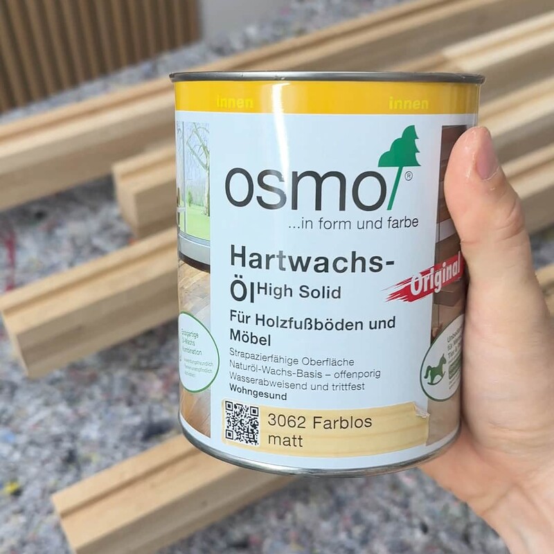 Das überschüssige Öl nach einigen Minuten mit einem Tuch abwischen. Dann lässt Du das Hartwachsöl gut in die Leisten einziehen.