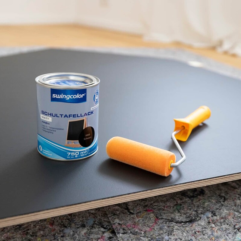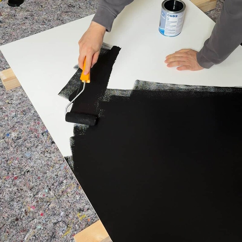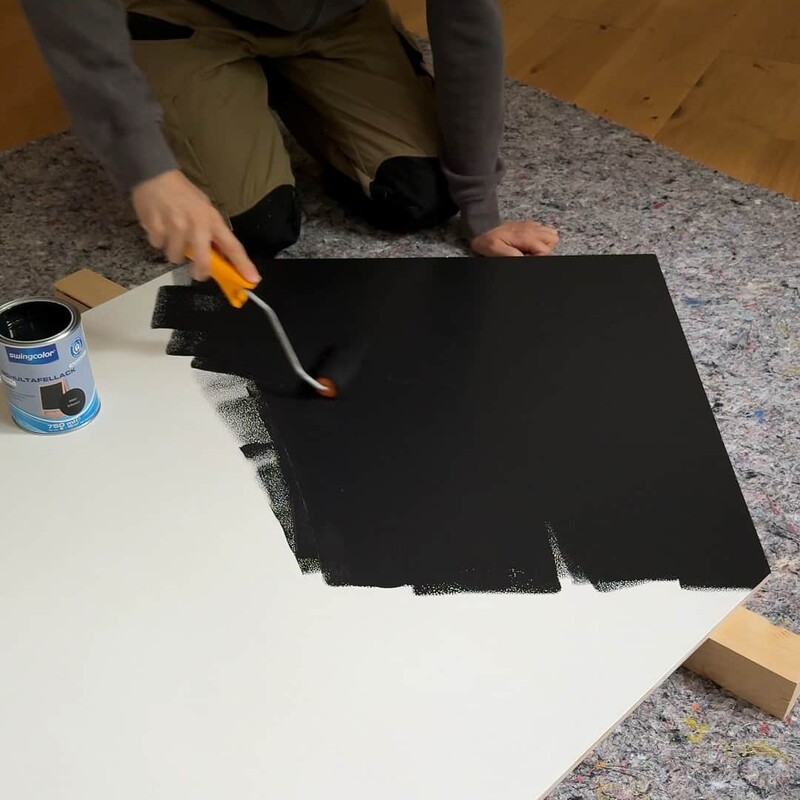 Danach trägst Du zwei Schichten Schultafellack mit einer Lackrolle auf.