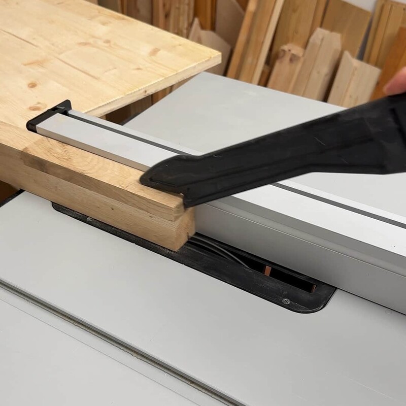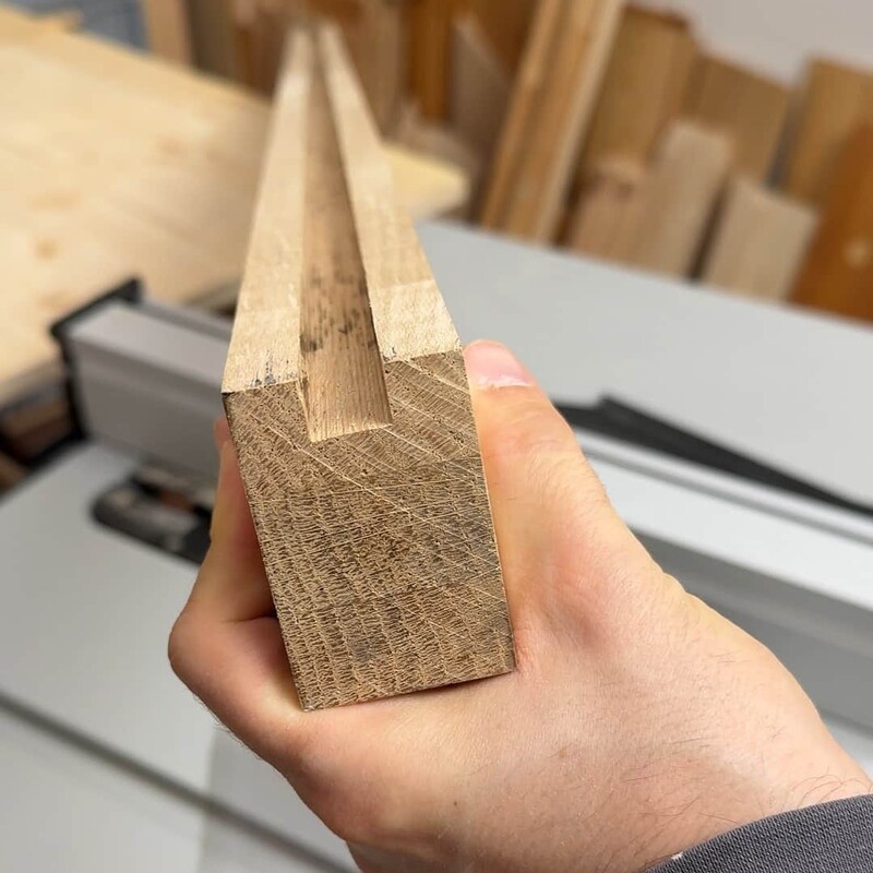 An der Tischkreissäge die Nuttiefe auf 10 mm einstellen. Die Nut wird mittig in die Leisten gesägt, sodass auf beiden Seiten etwa gleich viel Holz stehen bleibt.