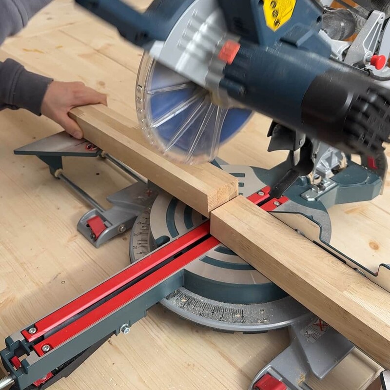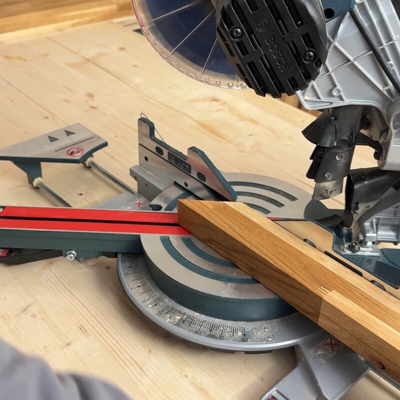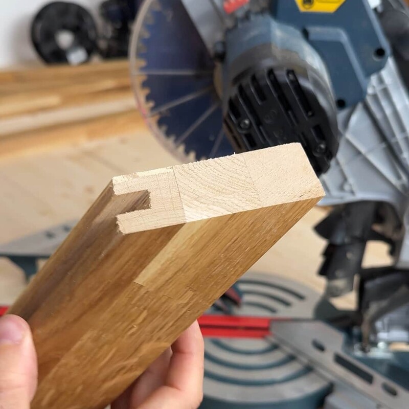 Die endgültigen Gehrungsschnitte wirst Du erst nach dem Nuten und der Passprobe mit der Holzplatte machen.
