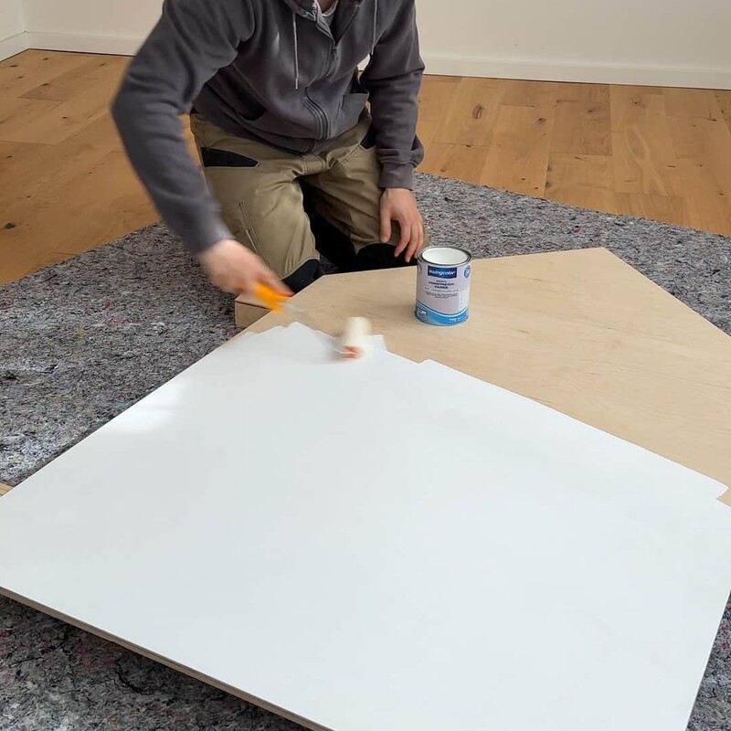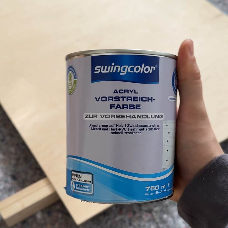 In der Zwischenzeit kannst Du die Platte gründlich abstauben. Zunächst streichst Du mit einer Grundierung die Holzplatte.