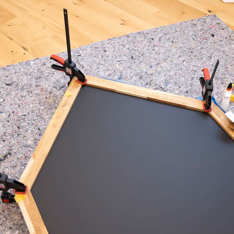 Die Leisten dann mit Holzleim zusammenfügen. Dazu schiebst Du die Platte beim Verleimen in die Nuten ein.