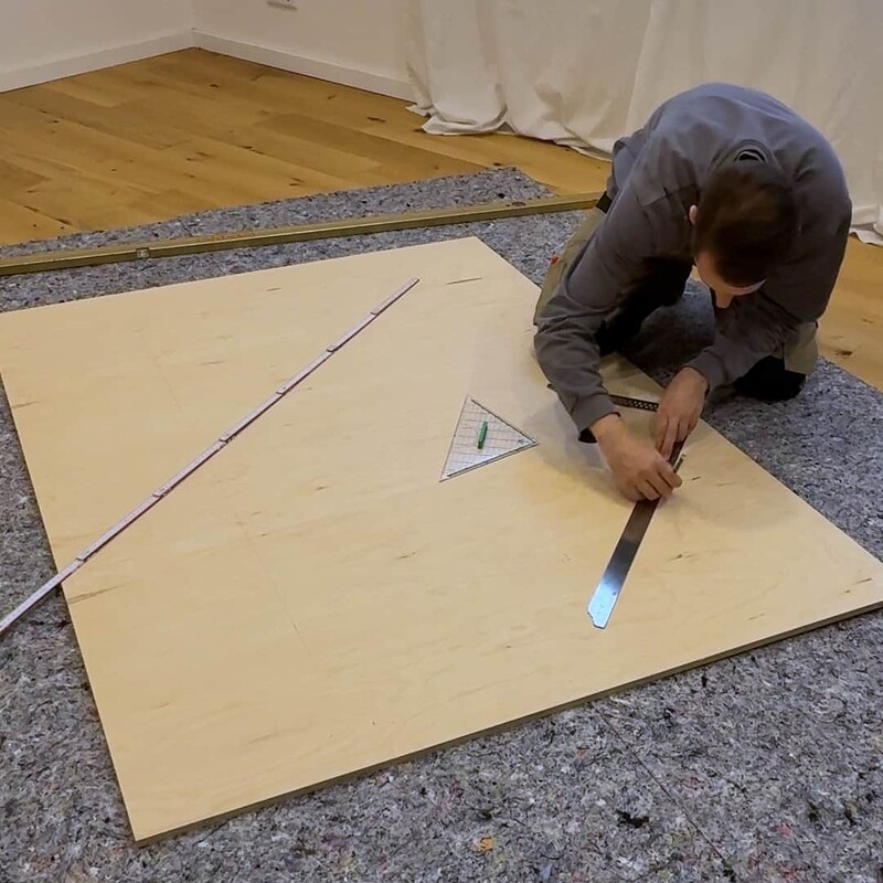 Nun legst Du die Platte probeweise in die genuteten Leisten und zeichnest Dir die Schnitte an.