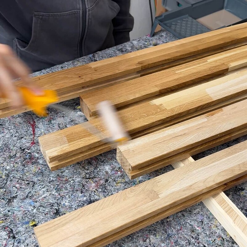Nach dem Sägen entstaubst Du zuerst alle Leisten, damit Du sie mit einem Hartwachsöl einölen kannst.