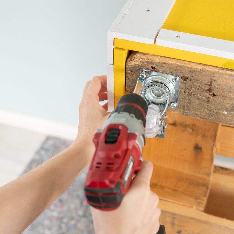 Für maximale Mobilität des massiven Palettenbetts wird an der Unterseite in die äußeren vier Palettenklötze je eine Lenkrolle mit Halbrundkopfschrauben (Ø x L: 5 x 30 mm) montiert.