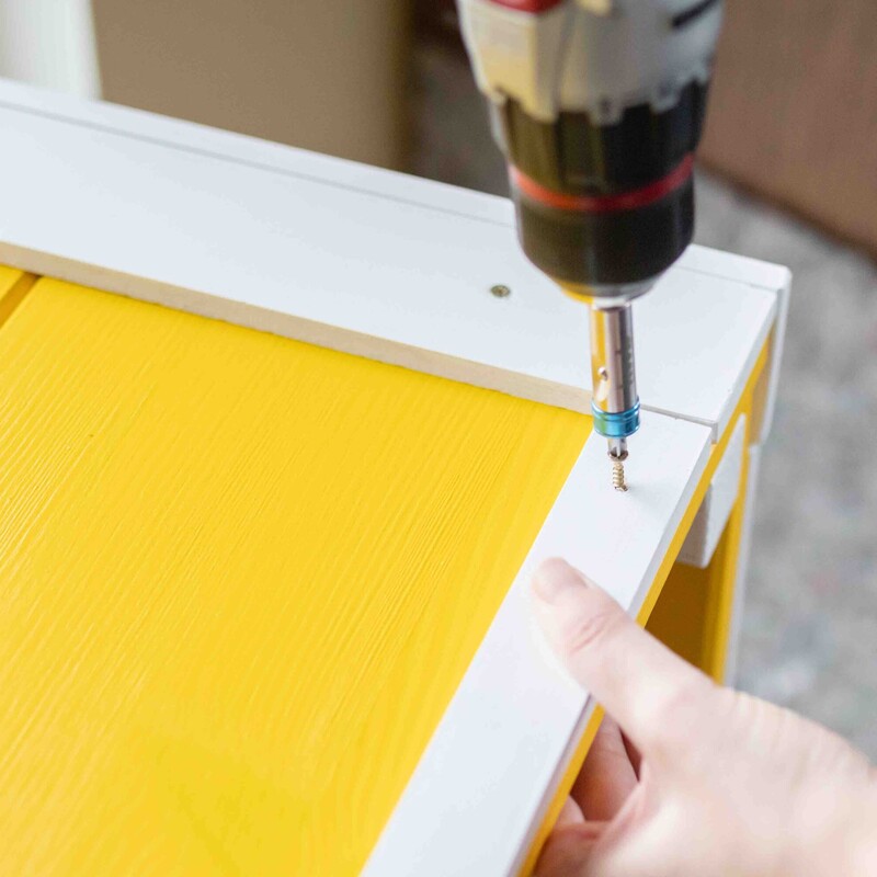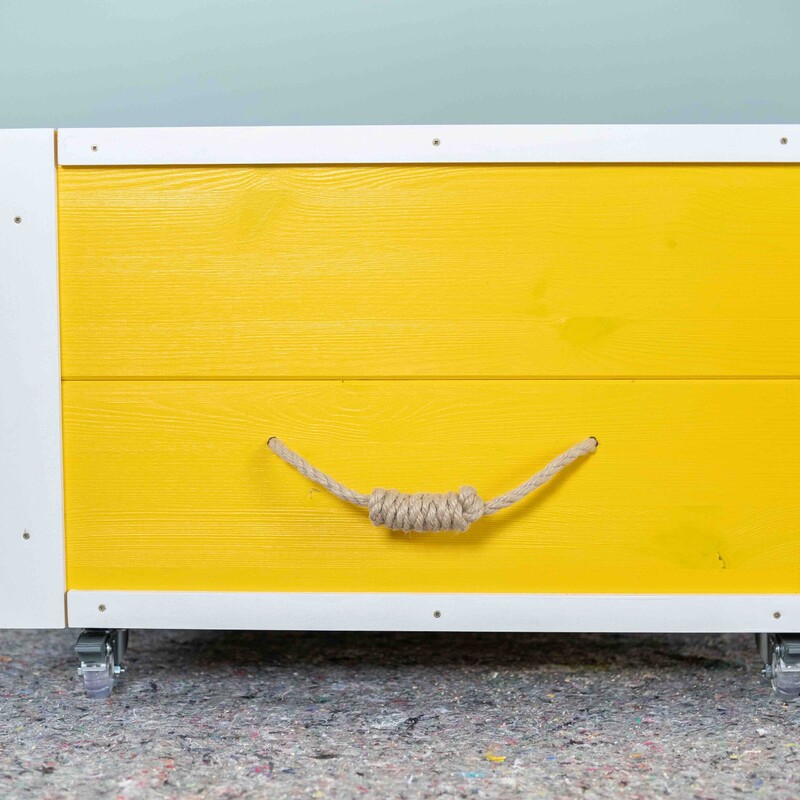 Jetzt wird’s bunt! Unser Beispiel-Hundebett hat Bloggerin Tanja zweifarbig gestrichen: Die Rahmenbretter wurden in Rapsgelb und die Zierleisten sowie die Quadratleisten in Altweiß lackiert. Natürlich kann jeder sein DIY-Hundebett auch in den eigenen Lieblingsfarben gestalten. Alternativ kannst Du das Holz auch mit einer farblosen Lasur oder mit Holzöl einpinseln.