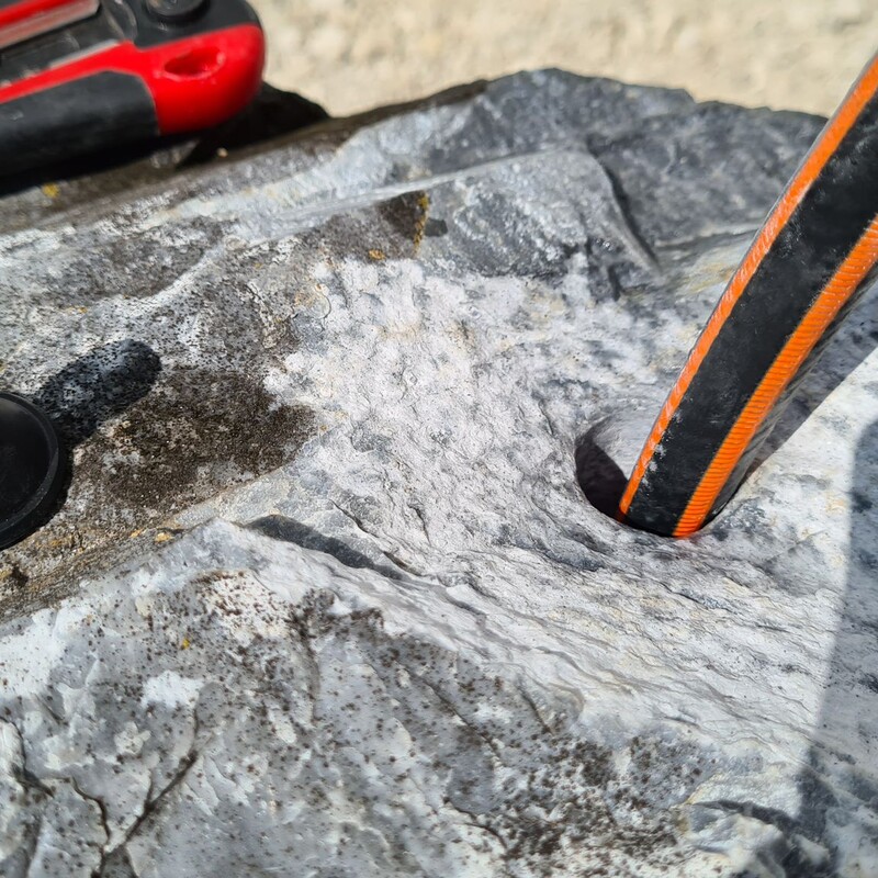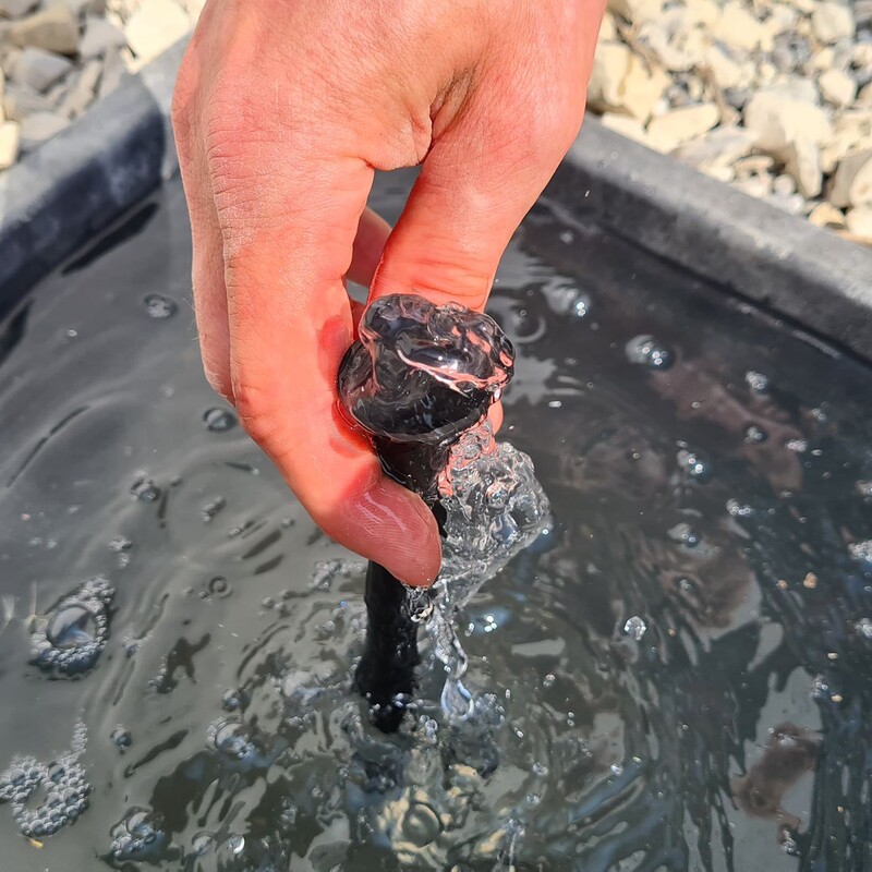 Da der Lichtsmog nachts ein Grund für den Rückgang der Insekten ist, verzichten wir auf die Installation von Licht an diesem Stein. Das sanfte Wassergeplätscher klingt sehr beruhigend und durch die Batterie kann die Pumpe auch Abends noch laufen und bietet somit auch nachtaktiven Tieren wie Faltern eine Trinkstelle.