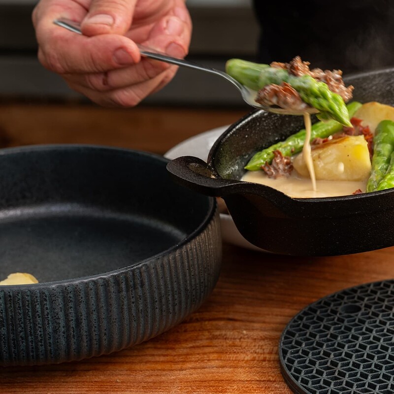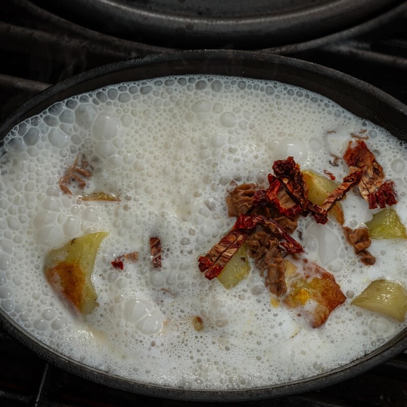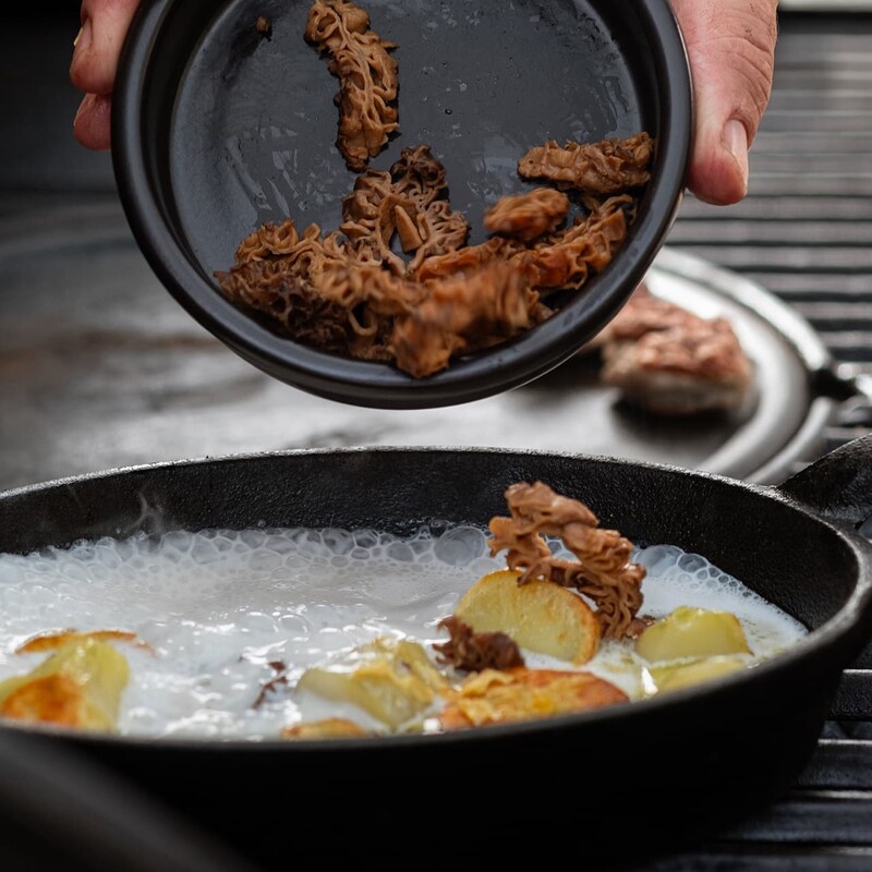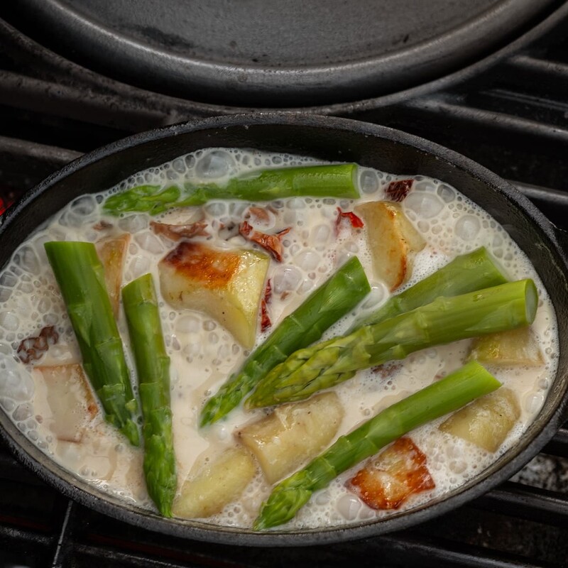 In die Grillpfanne kannst Du nun vorsichtig Öl geben und darin die Kartoffel goldbraun anbraten. Würze mit Salz und Pfeffer nach. Dann gibst Du die Kokosmilch hinzu. Jetzt nochmals nachschmecken und aufkochen lassen. Danach gibst Du die Tomaten und die Morcheln dazu. Zum Schluss den grünen Spargel zum Ragout geben.