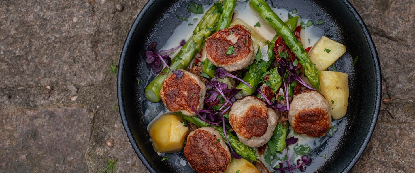 Noch einmal aufkochen lassen, nochmals abschmecken und mit den Geflügelfrikadellen auf Deinem Teller anrichten.