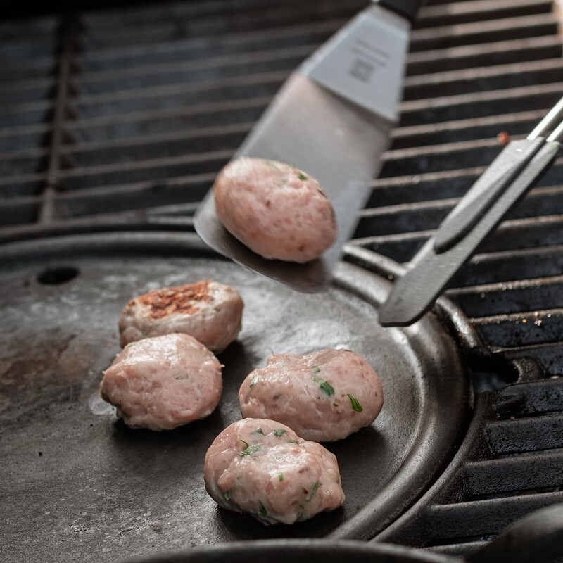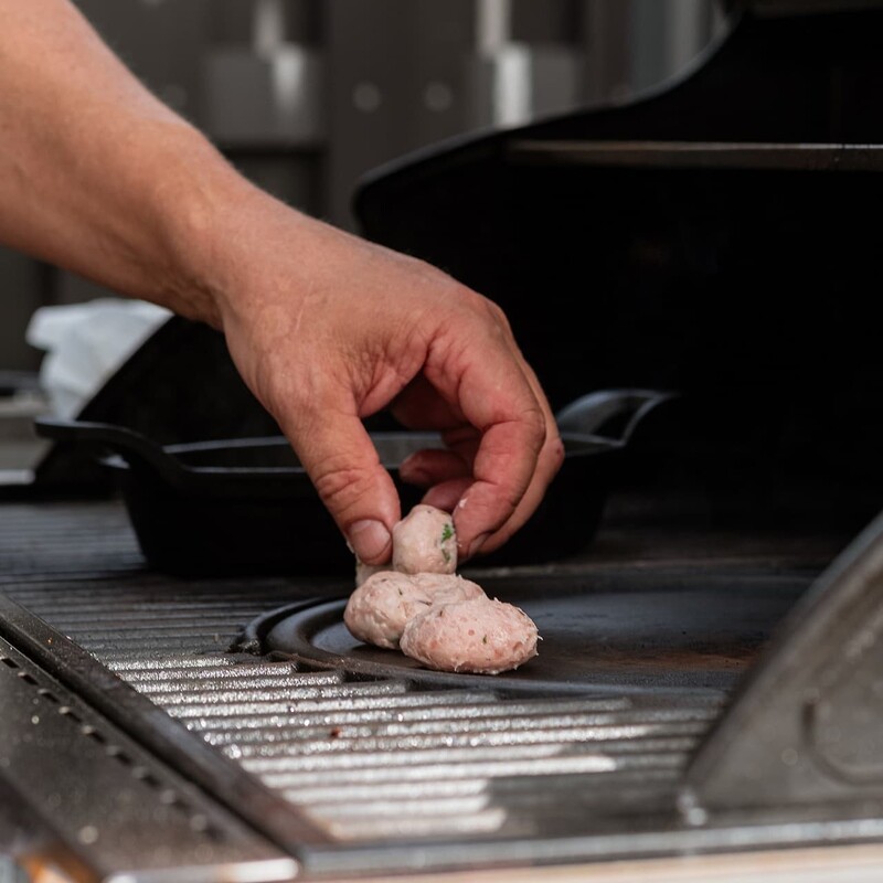 Du kannst nun die Geflügelfrikadellen auf die heiße Grillplatte legen. Brate sie von beiden Seiten goldbraun an.