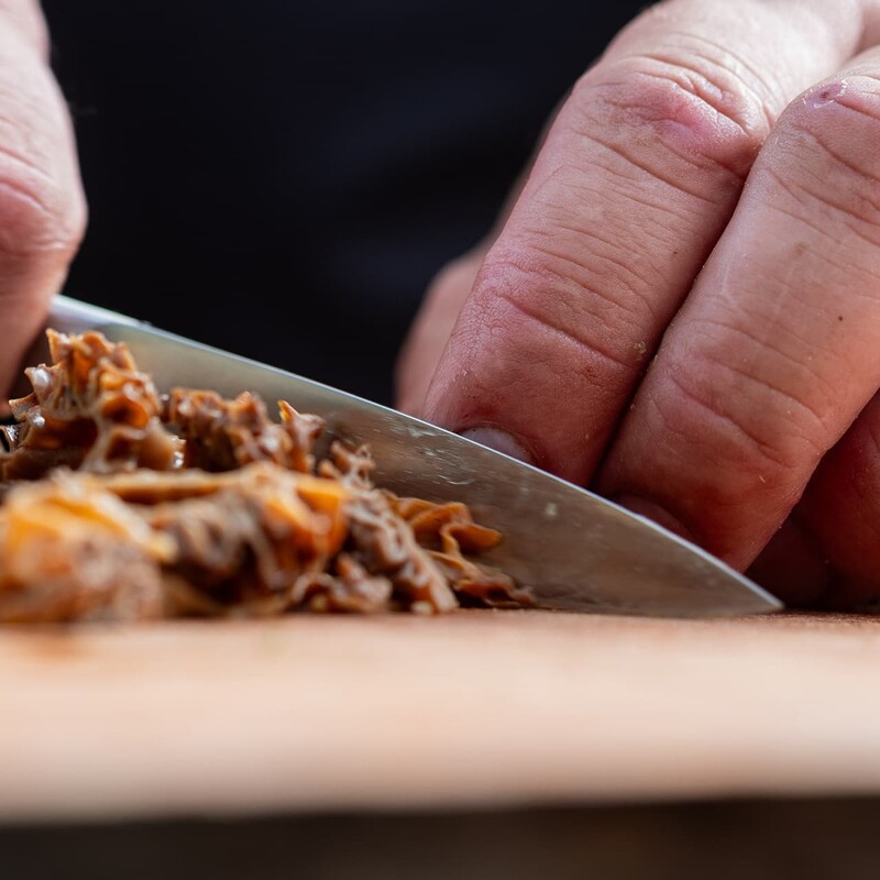 Die Morcheln ausdrücken und mit einem scharfen Messer in feine Streifen schneiden. Ebenso schneidest Du die getrockneten Tomaten in feine Streifen vor.
