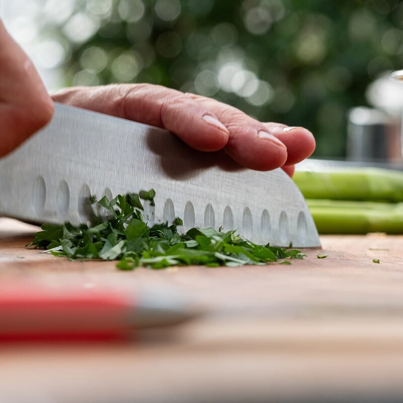 Die Kartoffel halbierst Du und den Spargel schneidest Du in gleichmäßige Stücke.