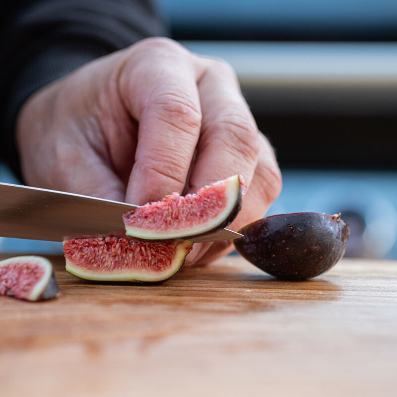 Den Grünkohl in mundgerechte Stücke zerkleinern oder hacken. Die Orangenfilets herstellen, die Feigen achteln. Aus dem Orangensaft, der beim Filetieren entsteht, am besten in einer Schüssel auffangen.