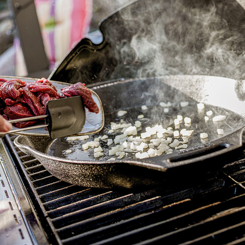 Den Grill auf höchste Stufe vorheizen und eine Gusseisenpfanne auf den Rost stellen. Die Oberschale abwaschen, trockentupfen und in feine Streifen schneiden. Darauf achten, dass das Fleisch richtig trocken ist zum Anbraten.