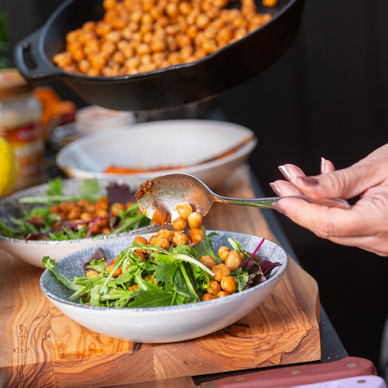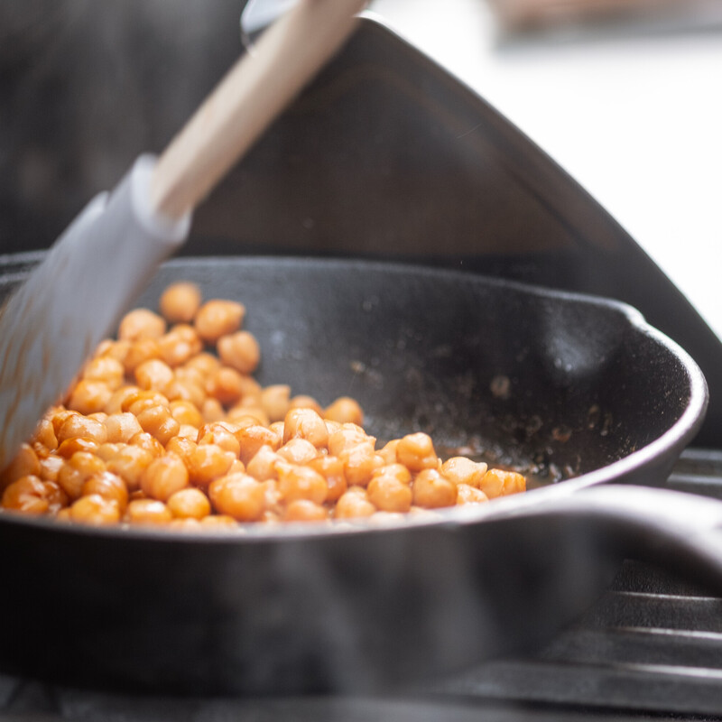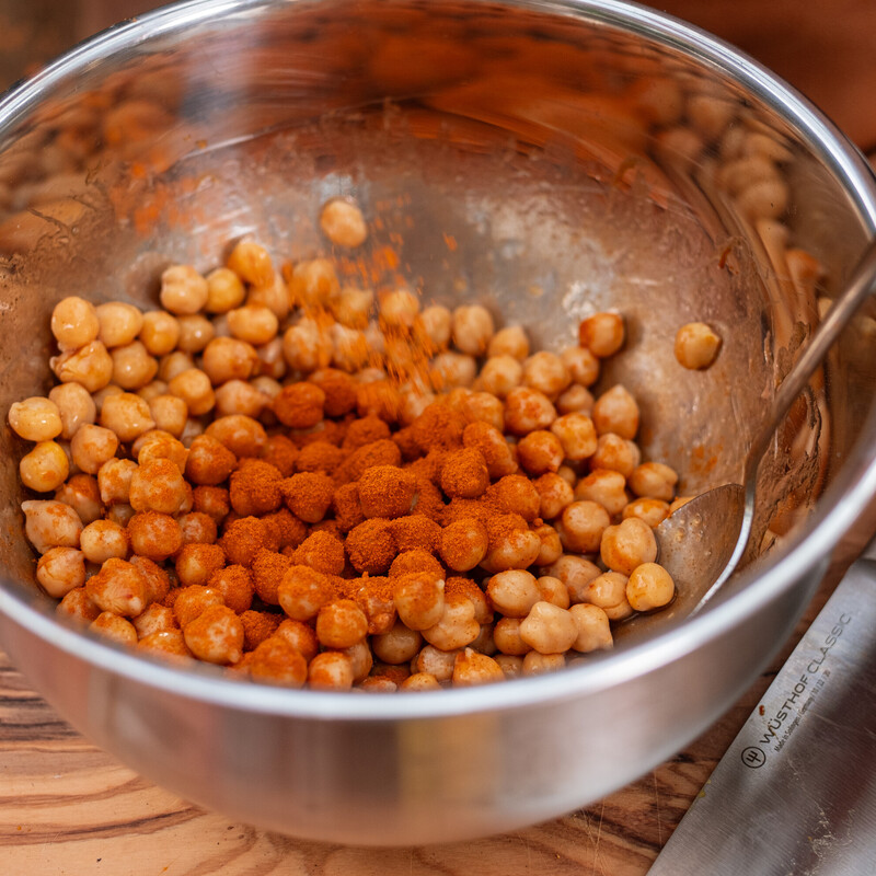Die Kichererbsen in einer feuerfesten Form mit etwas Olivenöl und dem rauchigen Paprikapulver bei ca. 200 Grad auf den Cliff 605-II für ca. 15 Minuten knusprig rösten.