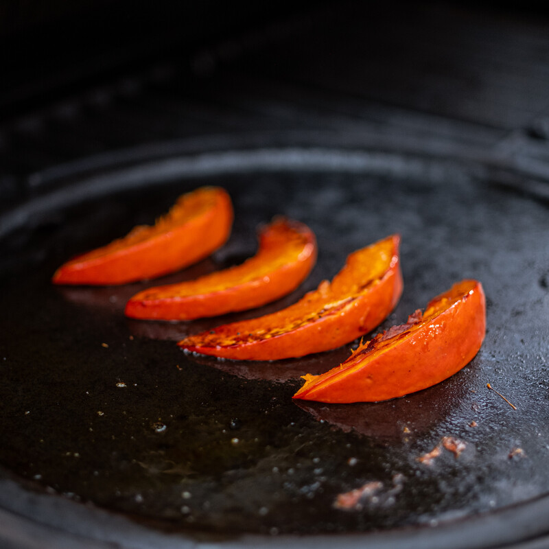 Den Hokkaido-Kürbis in schmale Spalten schneiden, mit den Gewürzen und Olivenöl kurz marinieren und auf der gusseisernen Platte bzw. Einsatz vom KMS-System grillen.