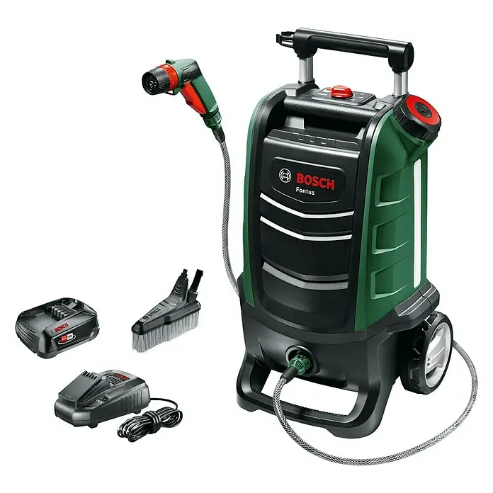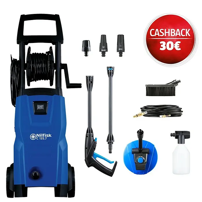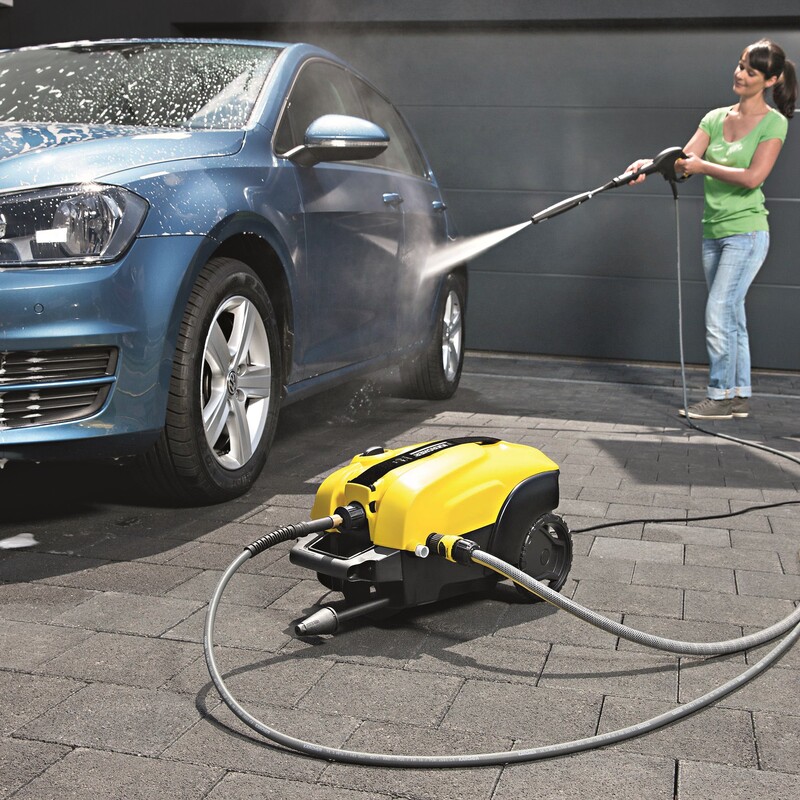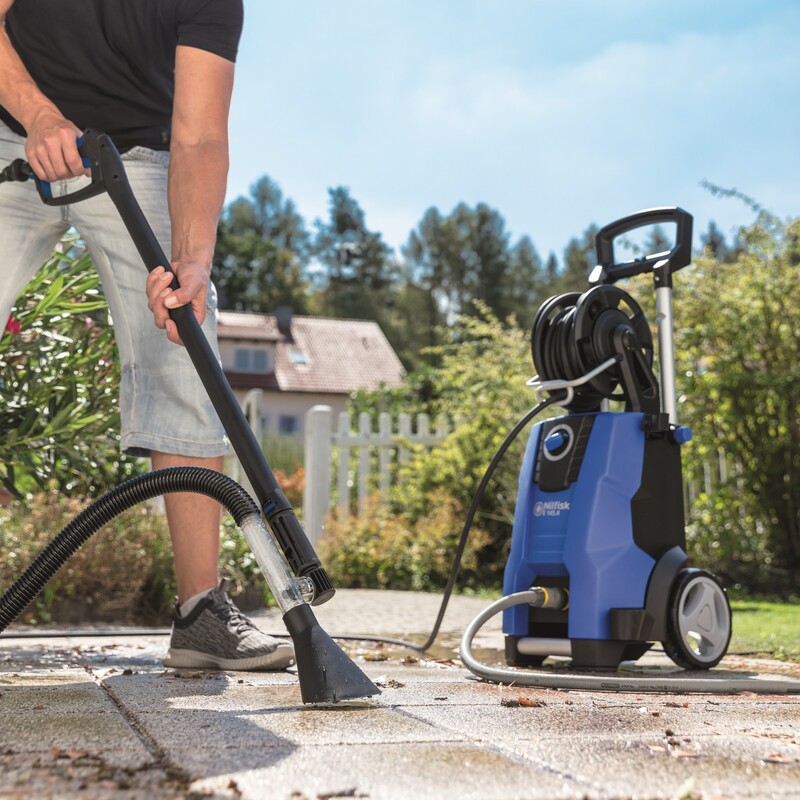 Nicht nur der maximale Druck, der bei Geräten für den Privatgebrauch meist irgendwo zwischen 100 und 175 bar liegt, ist entscheidend, auch die Förderleistung sollte beachtet werden. Denn den Wassertropfen zu beschleunigen reicht nicht aus, wenn nicht auch Wasser da ist, um den Schmutz wegzutragen. Und keine Sorge: Der Hochdruckreiniger spart immer noch Wasser gegenüber dem Vollstrahl des Gartenschlauchs: Er braucht nicht viel mehr als 10 Prozent der Wassermenge.