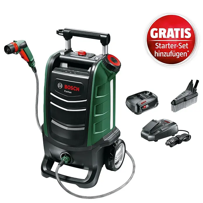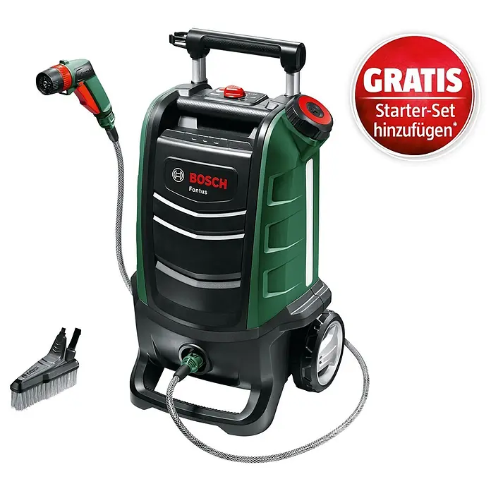 Für den Betrieb sind zunächst einmal zwei Anschlüsse wichtig: Strom und Wasser. Letzteres führst Du dem Gerät über den normalen Gartenschlauch zu.