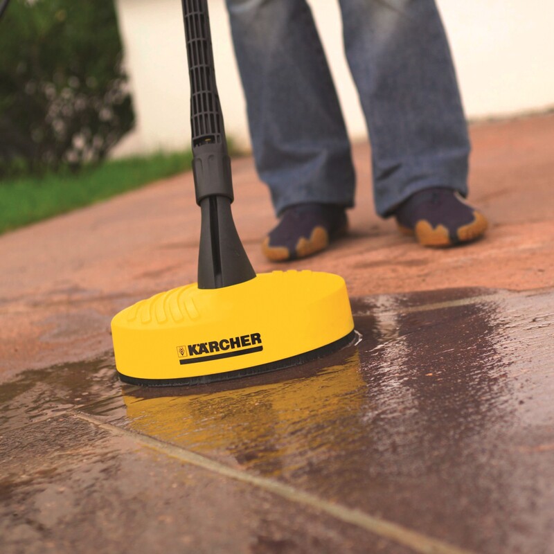 Die wie ein Ufo aussehenden Flächenreiniger stammen eigentlich aus der Reinigung von Terrassendecks, finden inzwischen aber auch immer mehr Einsatz an Wänden. Sie kann man an Griff oder Stiel kontrolliert und ohne viel Spritzerei über die Fläche führen. Dank Druckregulierung lassen sich unterschiedliche Oberflächen so optimal behandeln.